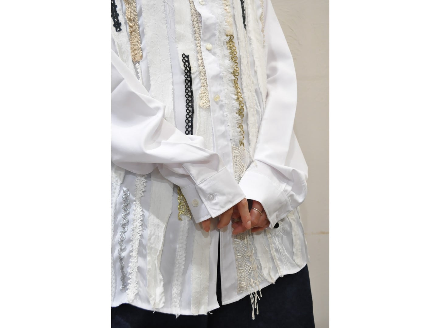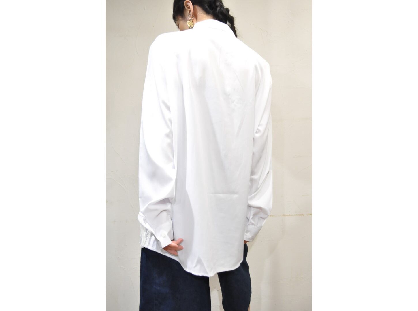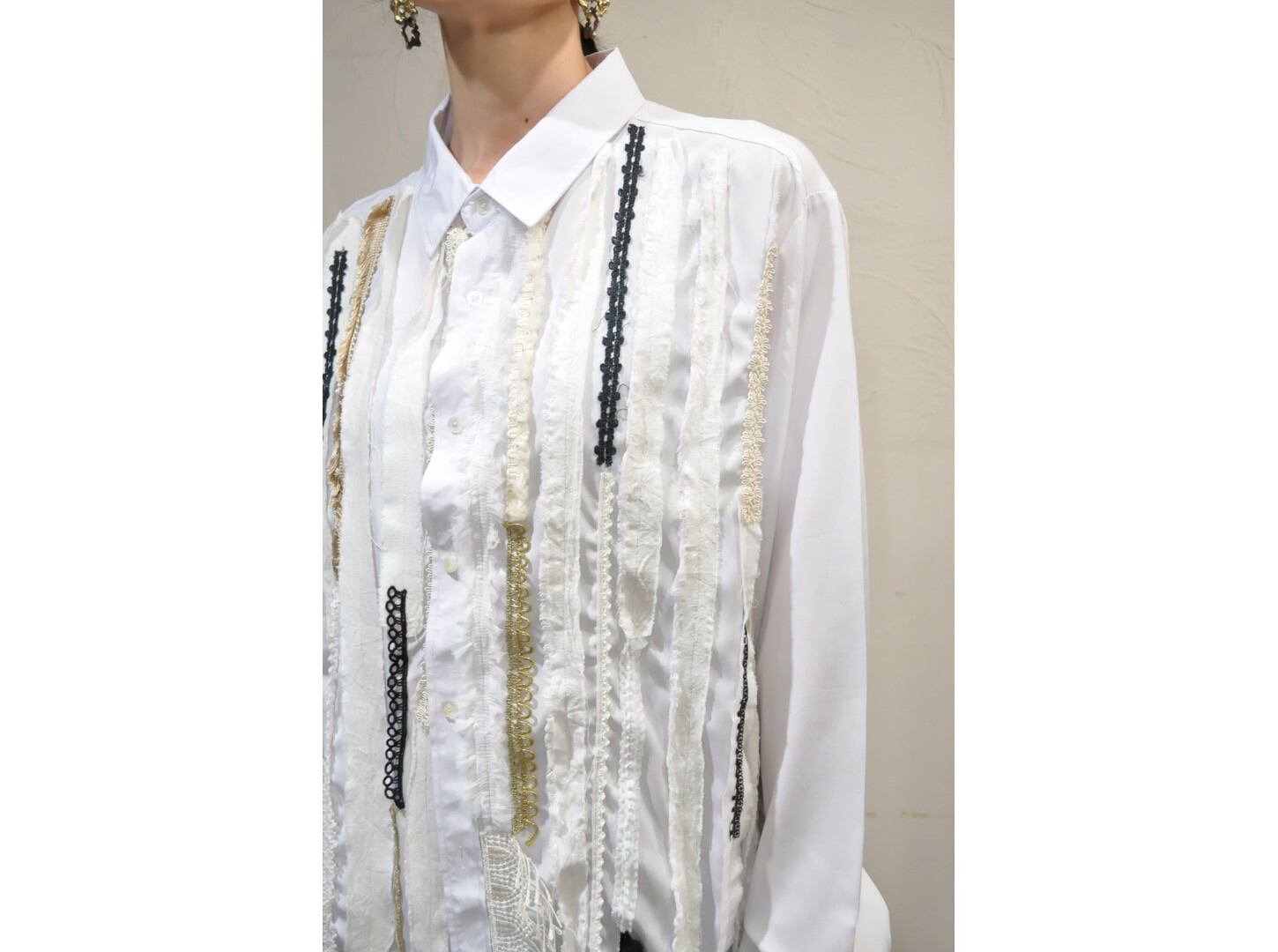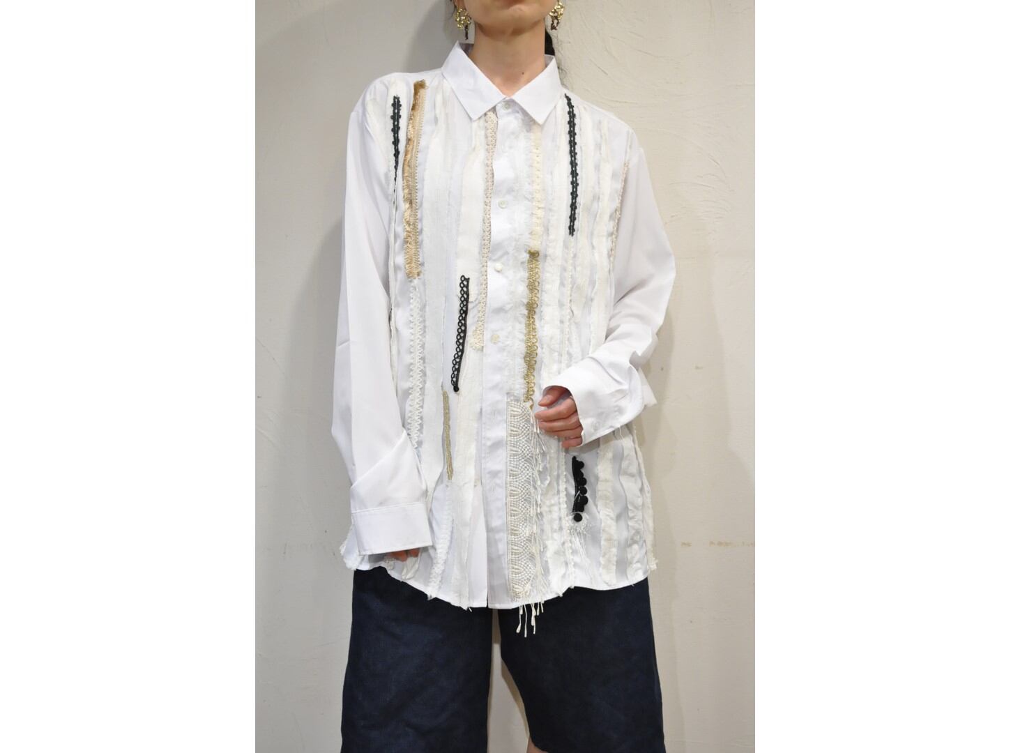 ●デザイナーがストックしていた希少な生地やヴィンテージのブレード・レースなど贅沢に使い装飾した、オーバーサイズのシャツ。