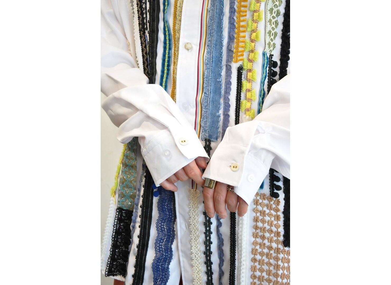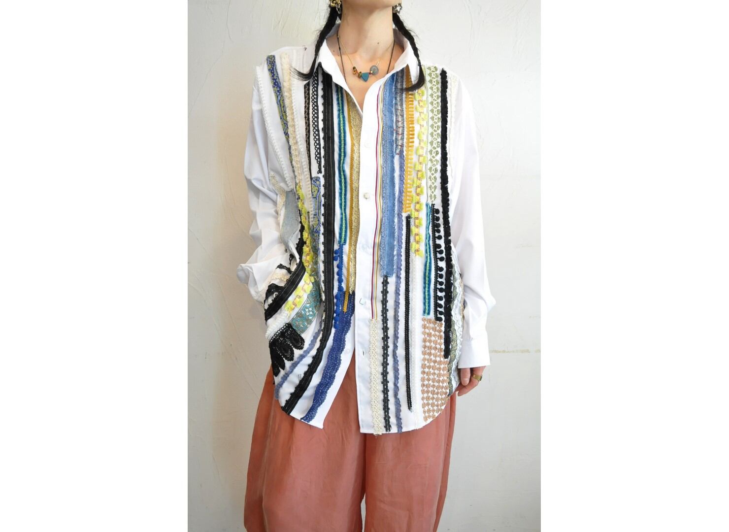 ●デザイナーがストックしていた希少な生地やヴィンテージのブレード・レースなど贅沢に使い装飾した、オーバーサイズのシャツ。