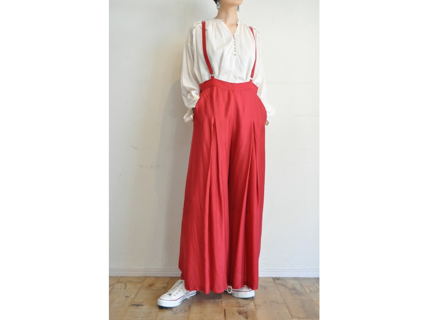 サスペンダータイプのワイドパンツ。