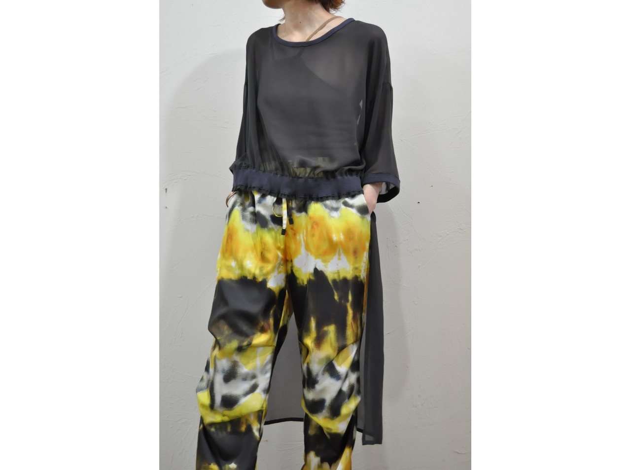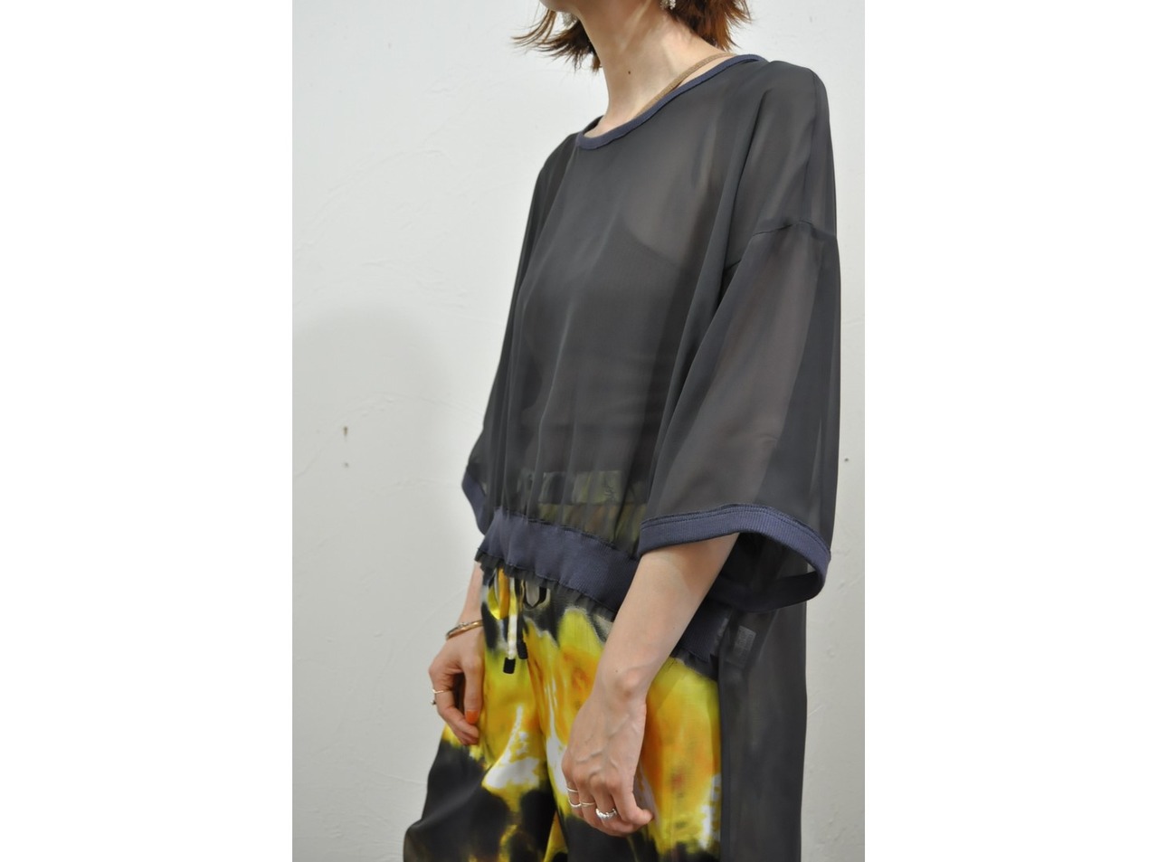 ●上質なシフォンとリブを掛け合せたトップス。