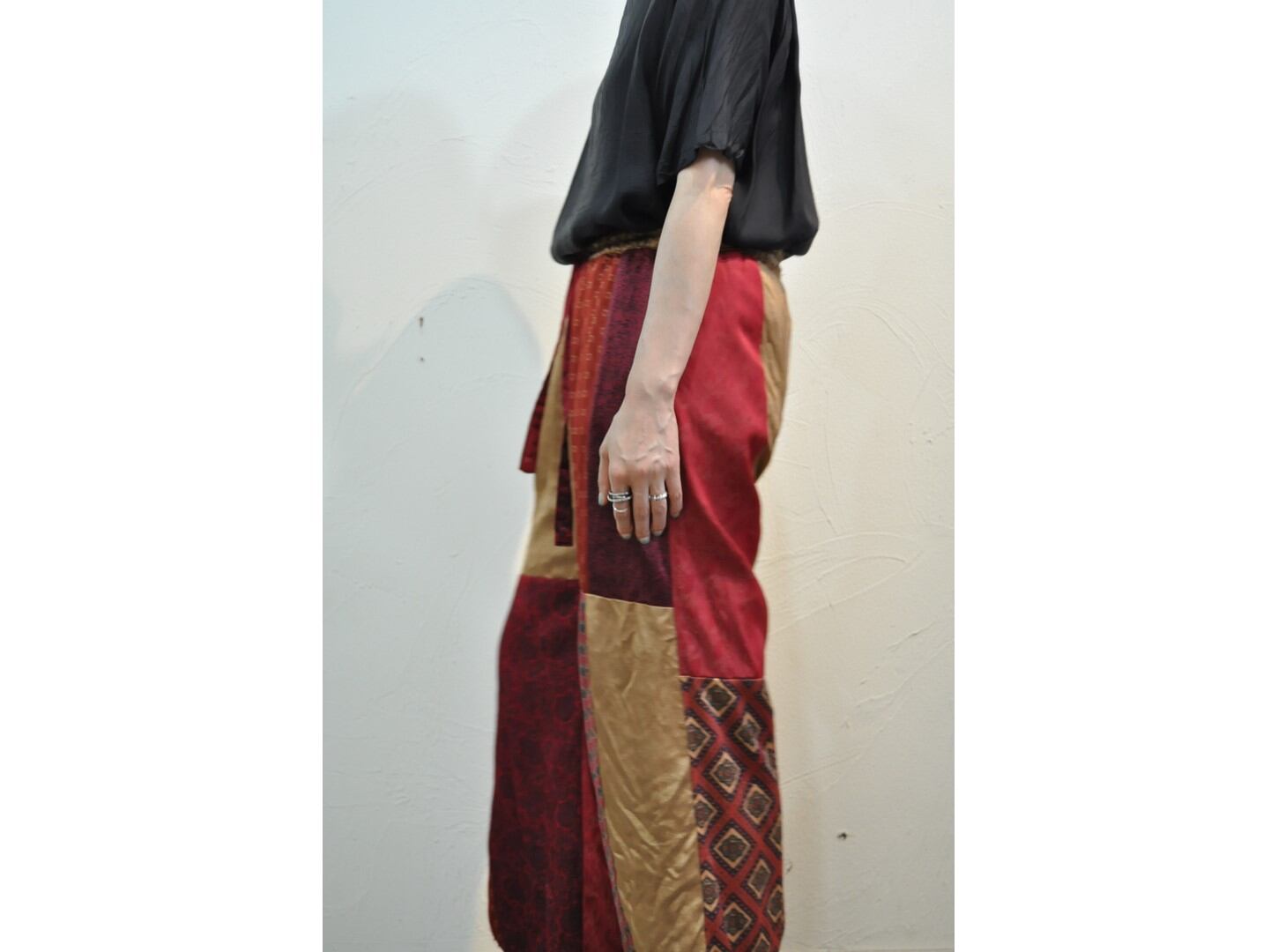 ●ユーズドのユーロサテンパジャマをメインにパッチワークし、製品染めを施したパンツ。