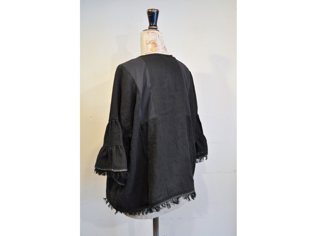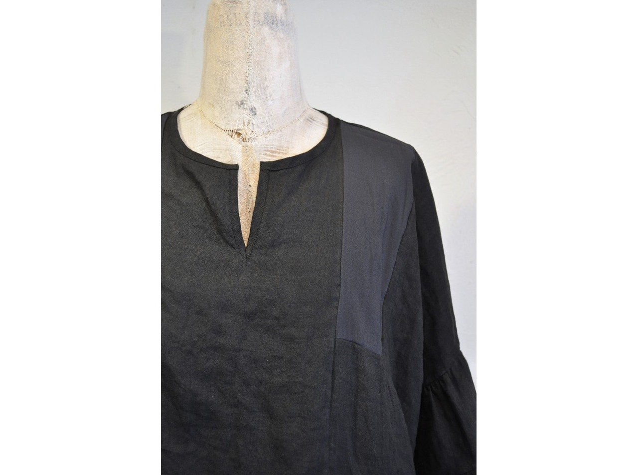 ●柔らかなリネンにリネンタッチのシフォンを掛け合わせたブラウス。袖のボリューム感、ワイドな身幅、衿の開きも綺麗で着やすい1枚です。