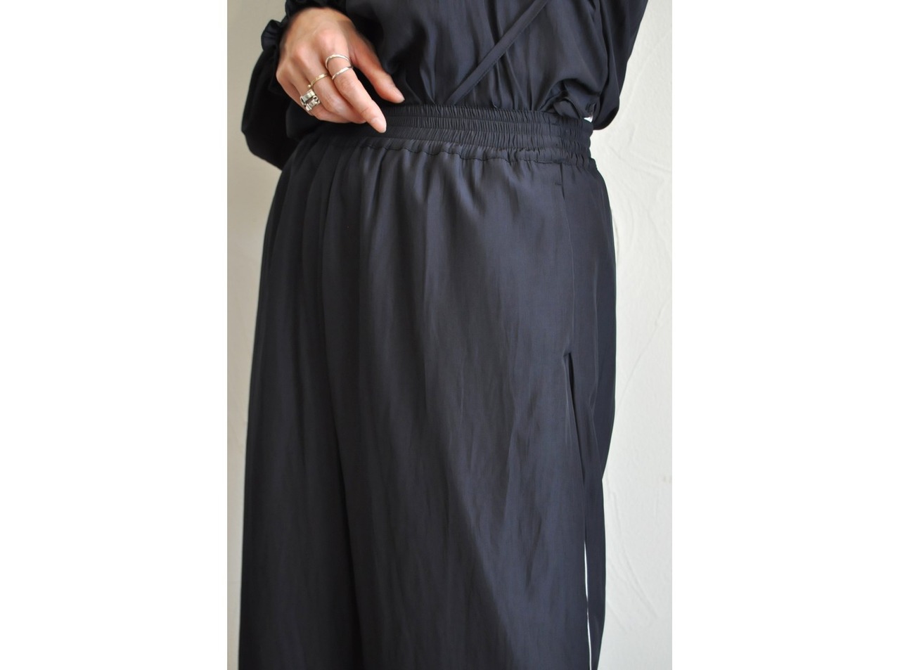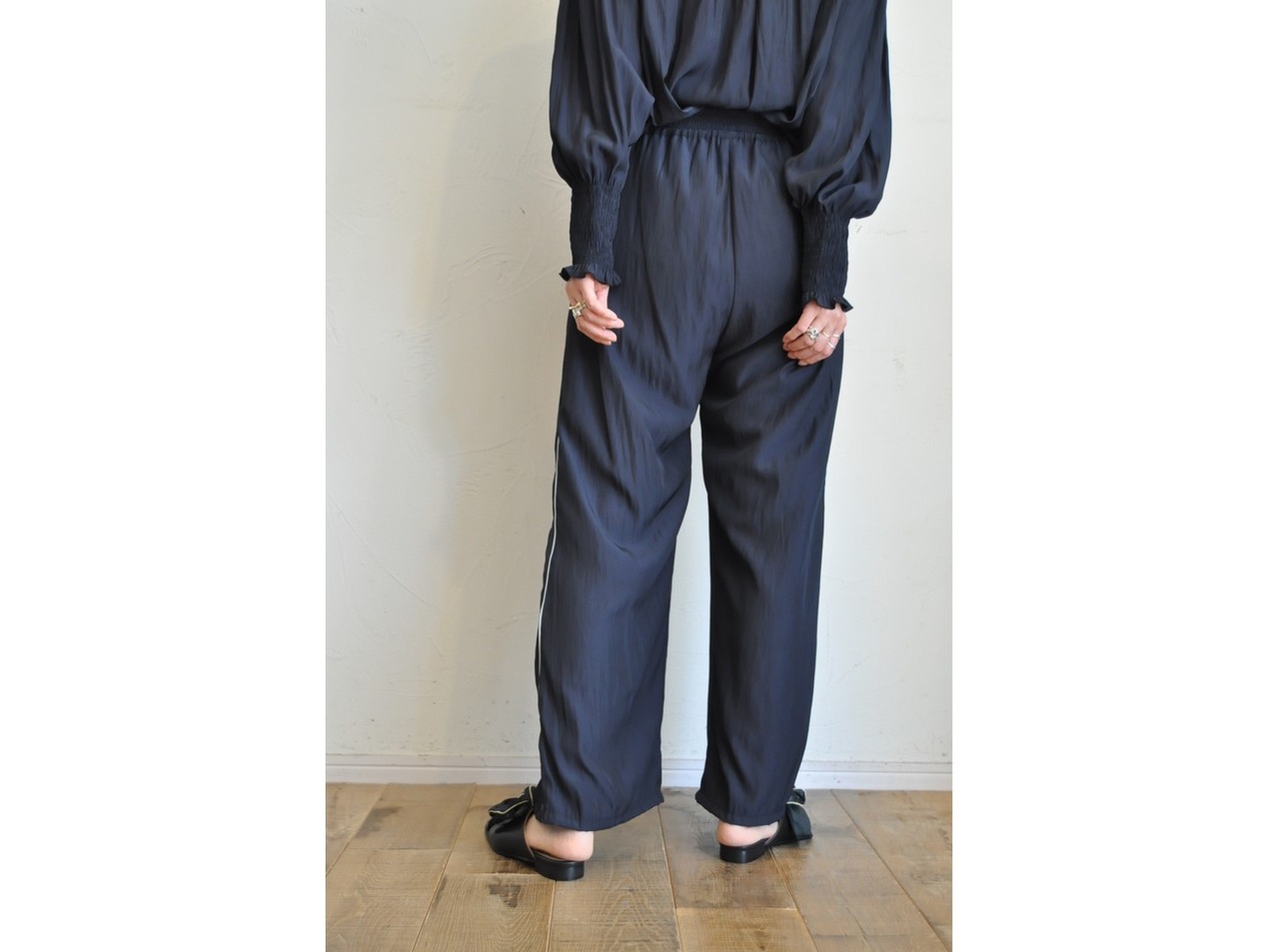 ●柔らかく、さらりとしたビジュー生地を使用したウエストゴム仕様のイージーパンツです。