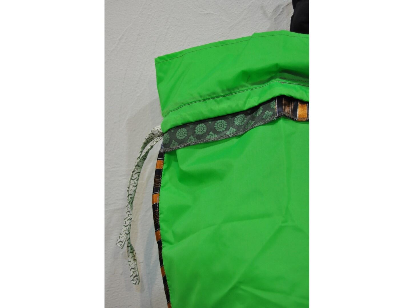 ●ナイロン素材のシューズ袋をカスタムし、古着パジャマをフリルやトリミングに使用した小ぶりのバッグです。