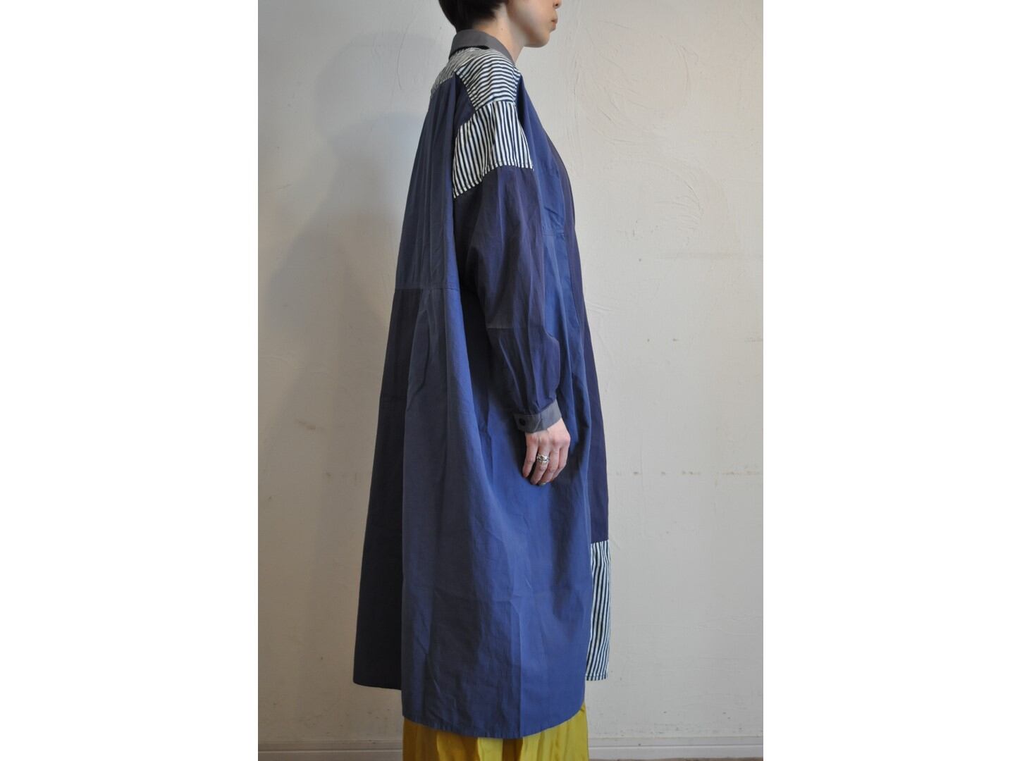 ●4種の生地を掛け合せたシャツワンピース。