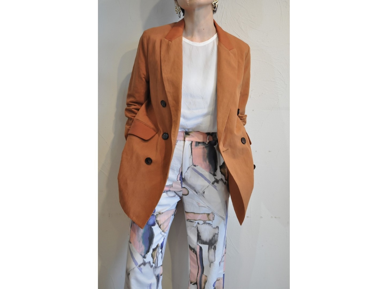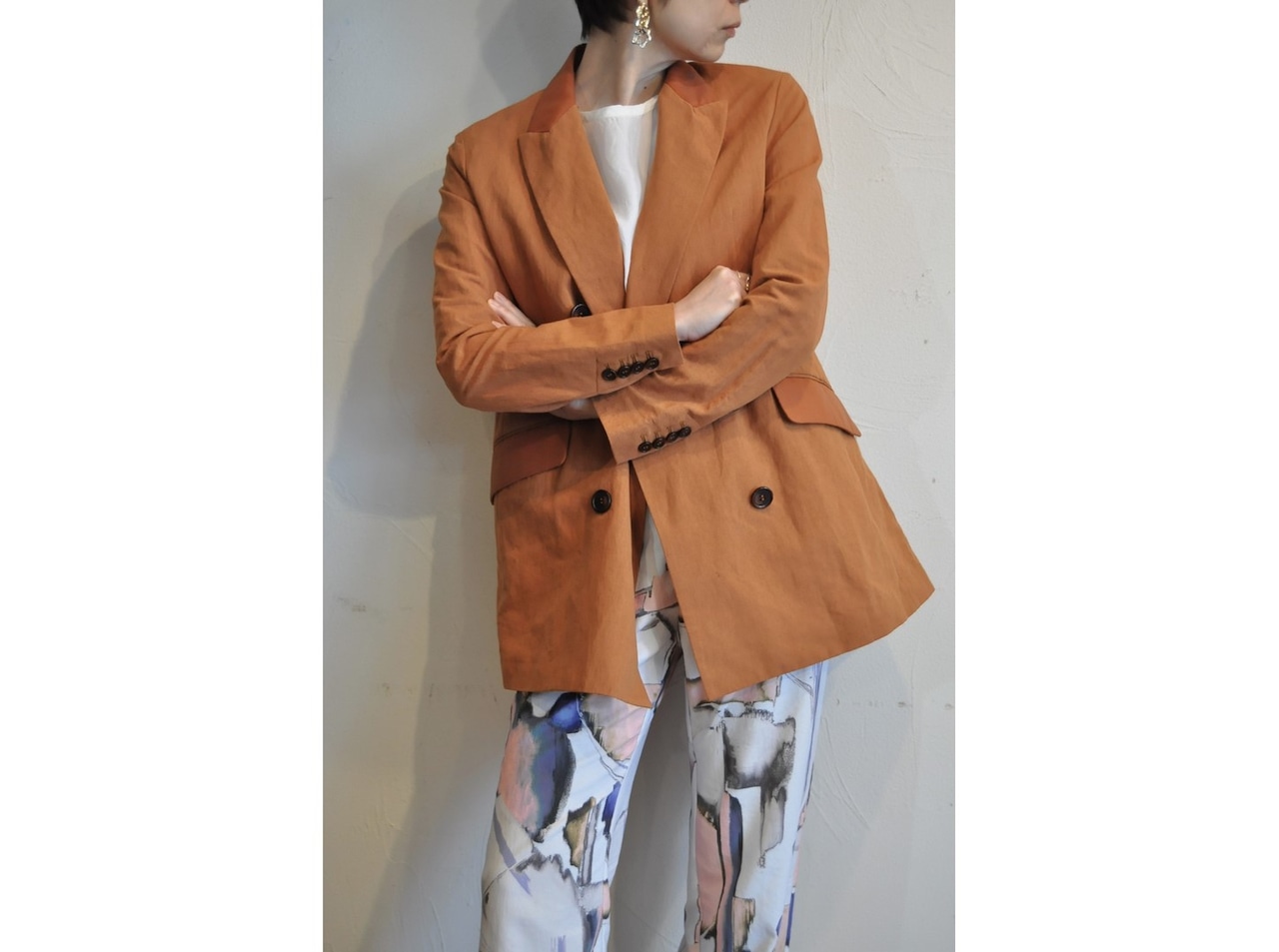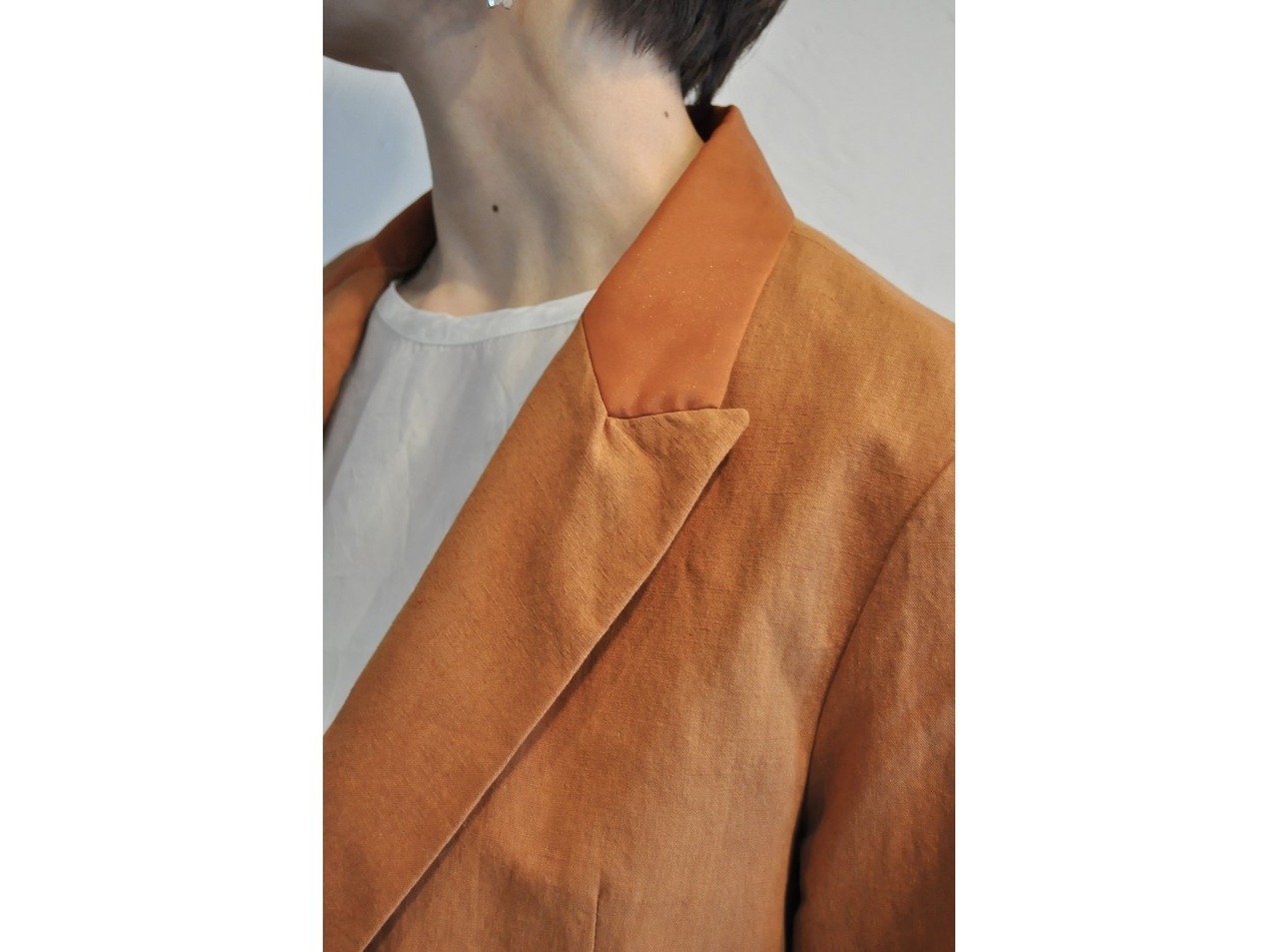 ●深い襟あきとサイドベンツでスッキリとしたシルエットのジャケット。