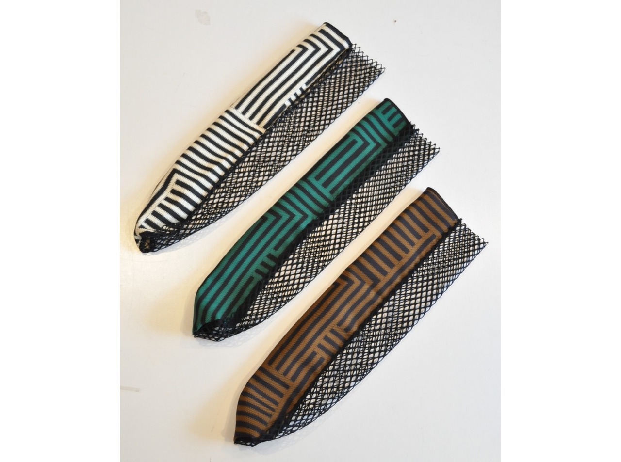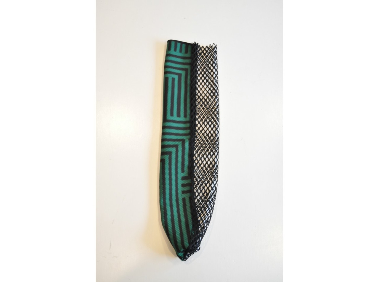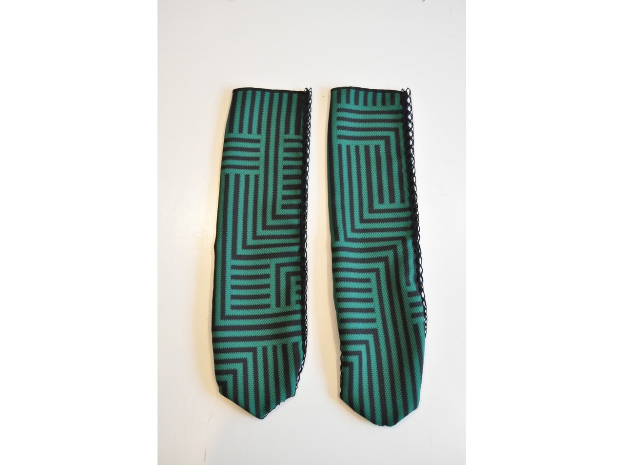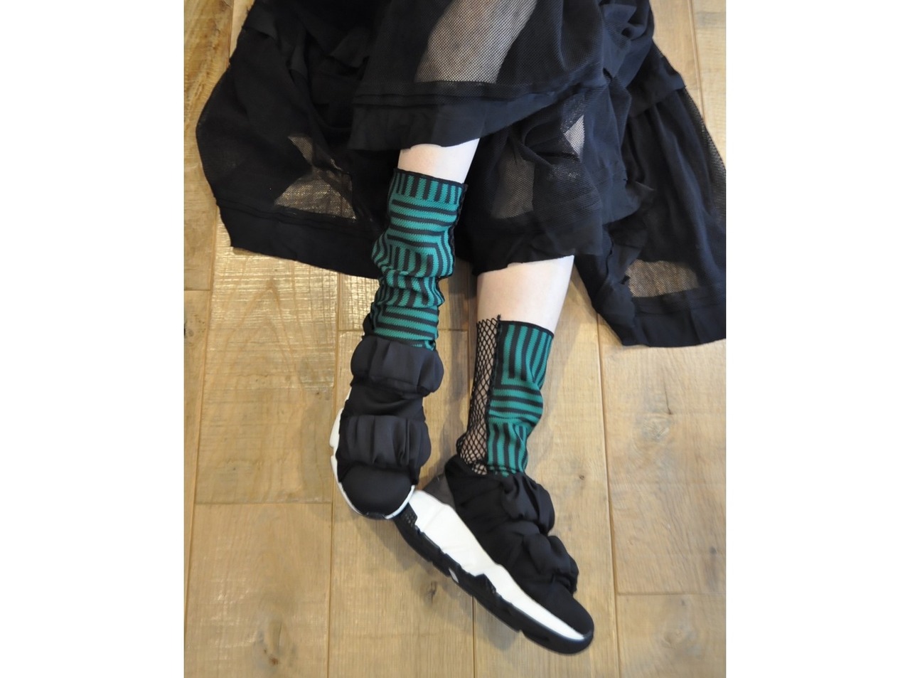 ●片面がジオメトリック柄の生地、片面がブラックのフィッシュネット生地のソックス。