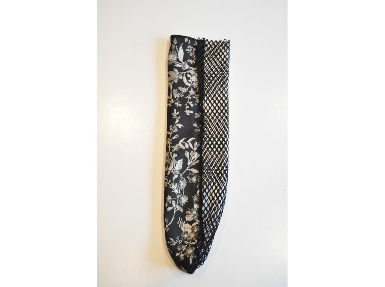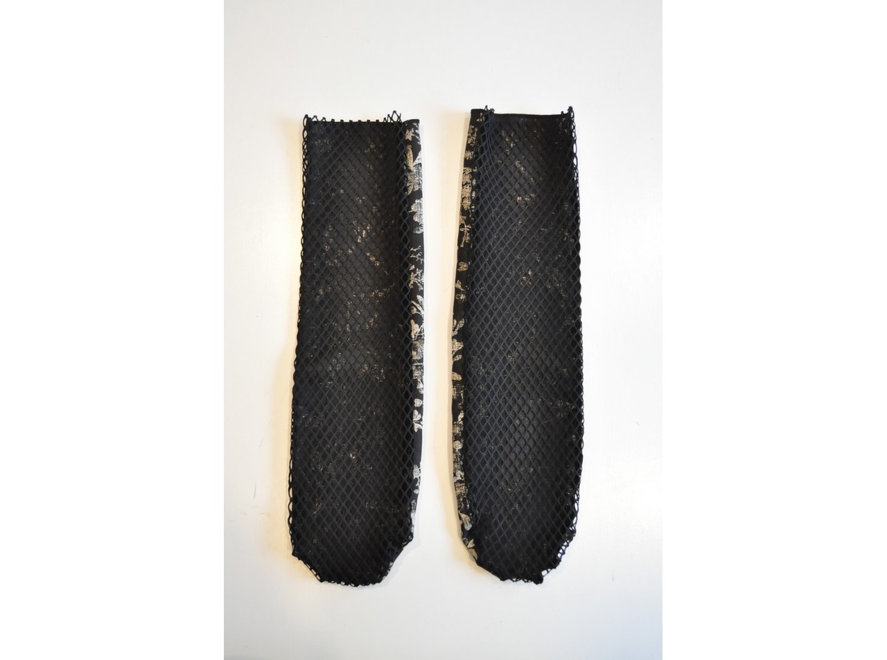 ●片面がボタニカル柄の生地、片面がブラックのフィッシュネット生地のソックス。