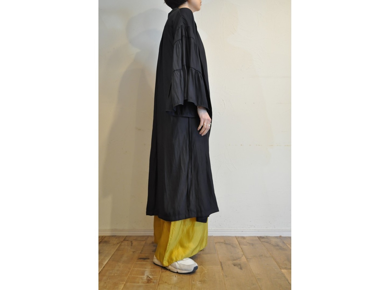 ティアードになった袖、ワイドな身幅、たっぷりギャザーの入ったバックスタイルと、贅沢に生地を使っています。