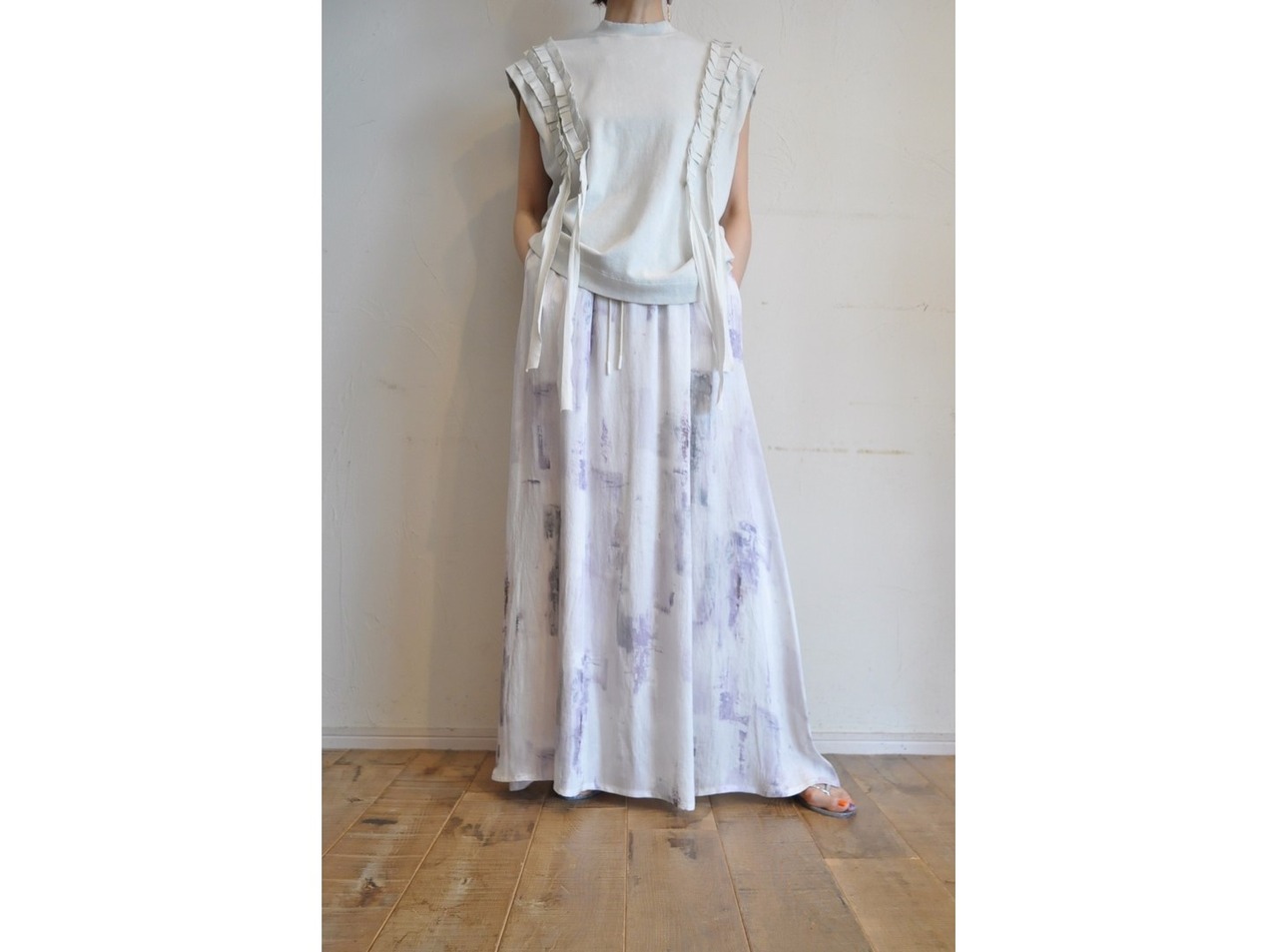 ●アセテート素材にオリジナルペイント柄を施したロングスカート。