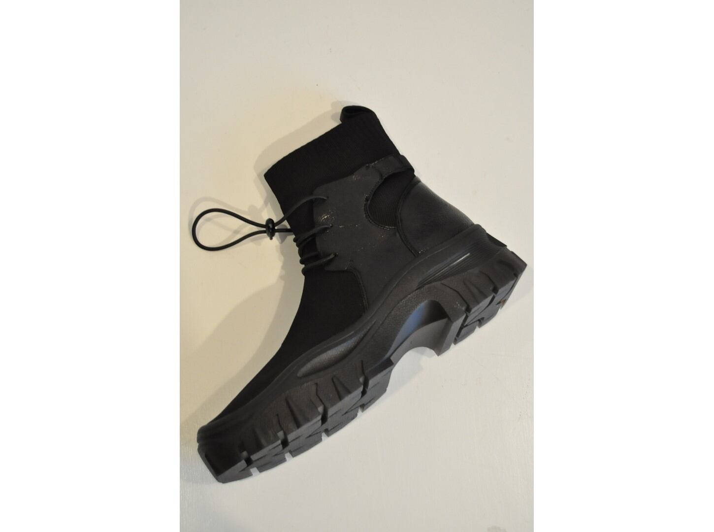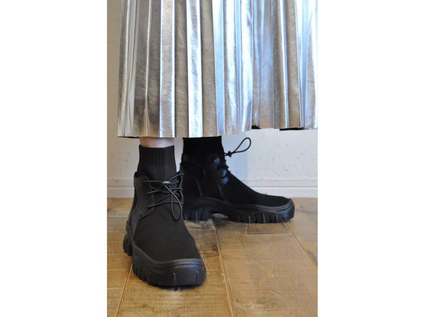●伸縮性のあるニットとゴートレザーを組み合わせたデザインのショートブーツ。