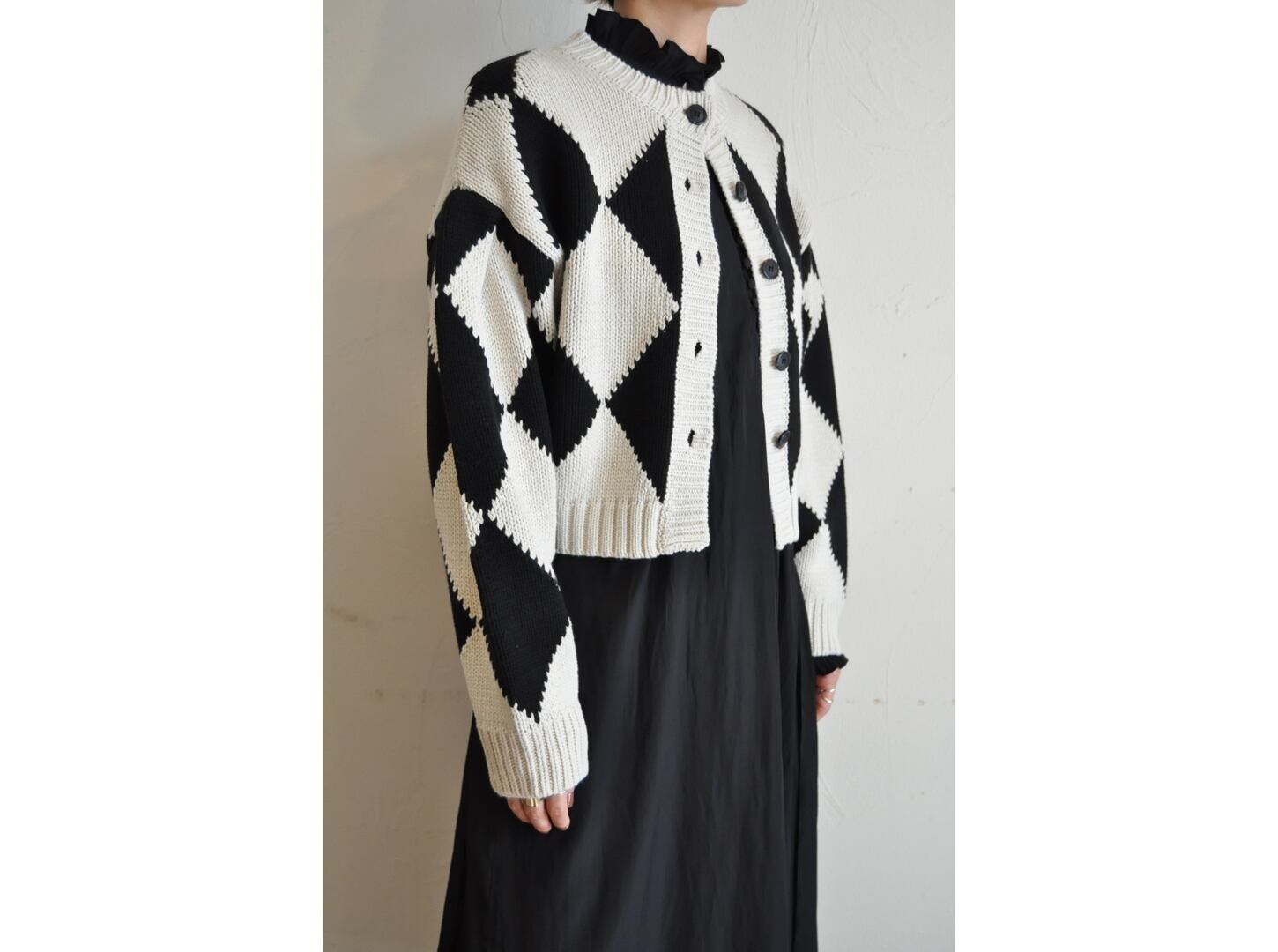 ●大胆なダイヤ柄がインパクトのあるサラッとした素材の綿・アクリル混カーディガン。