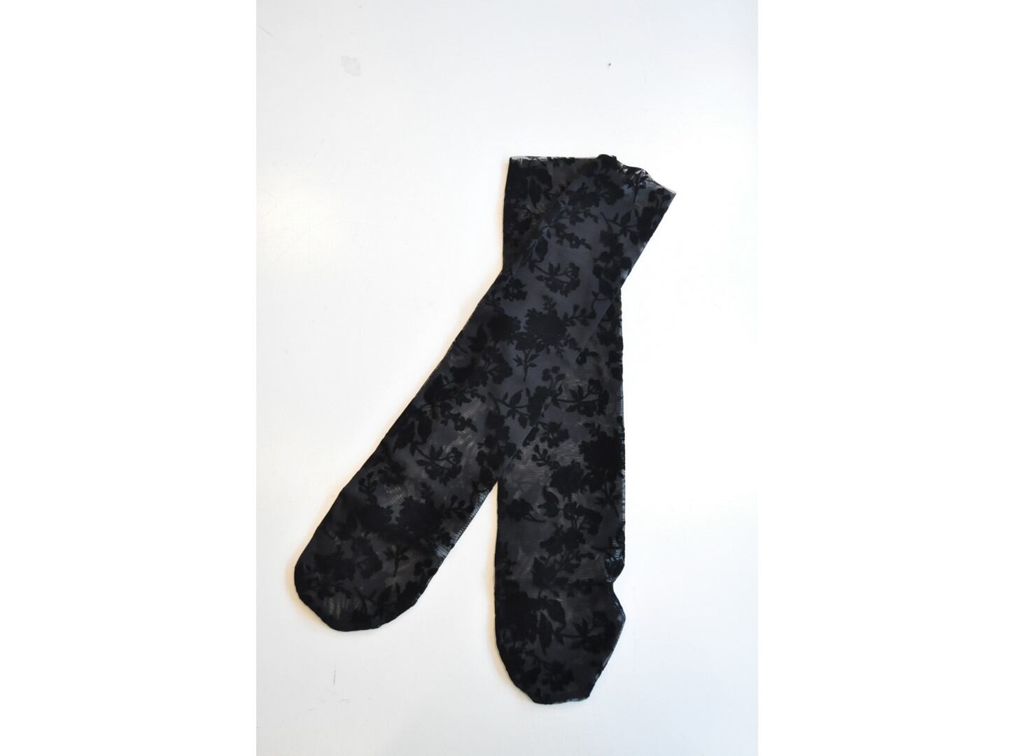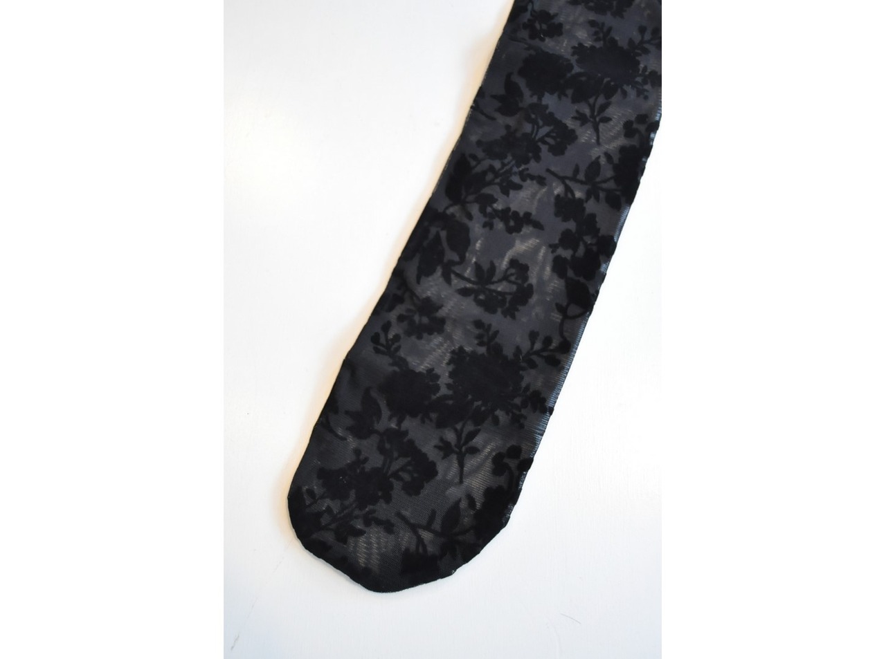 ●伸縮性のあるチュールにフロッキーで花柄をあしらったソックス。