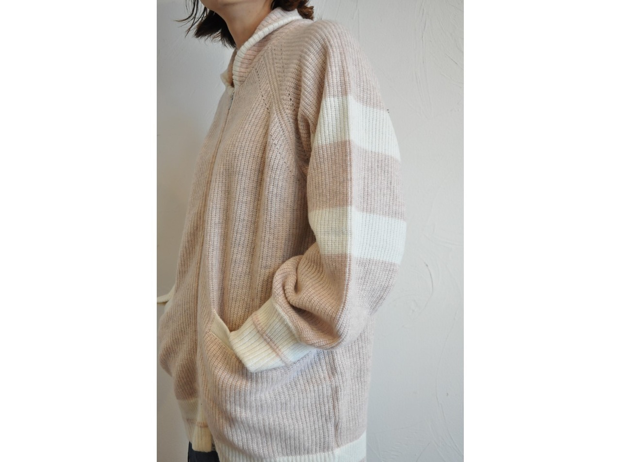 カレッジカーディガンをベースに、フロントファスナーや袖の太い2本ラインなど変化をつけたデザインになっています。