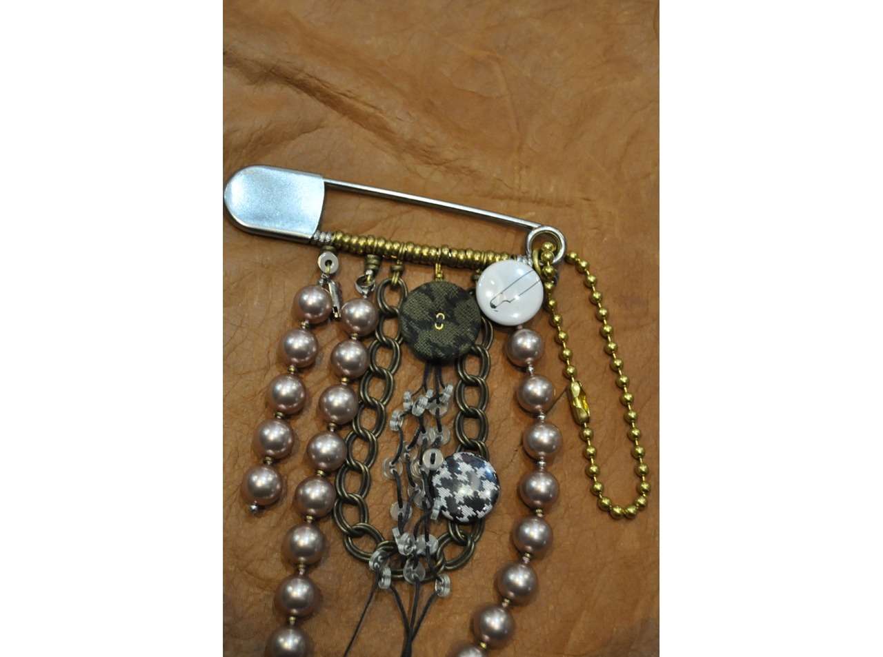 古いイミテーションパール、オリジナルファブリックのボタン、真鍮パーツなどを贅沢に使用した存在感のあるシリーズです。