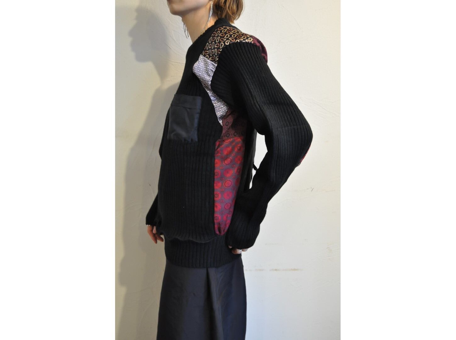 柄の生地の差し込みとリボンによって無骨な軍物セーターも可愛らしい印象になっています。