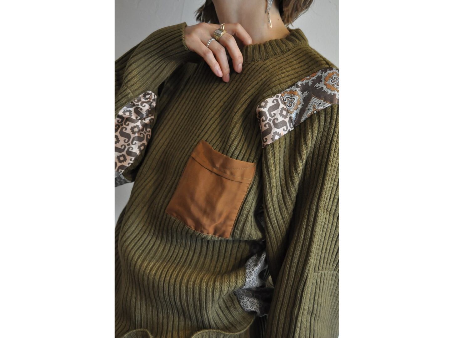 柄の生地の差し込みとリボンによって無骨な軍物セーターも可愛らしい印象になっています。