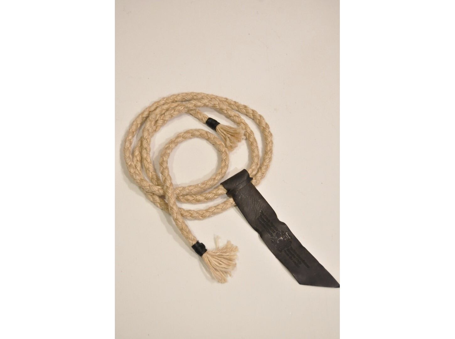 ブランドロゴが刻印されたレザーのタグがついた、細めのロープベルト。