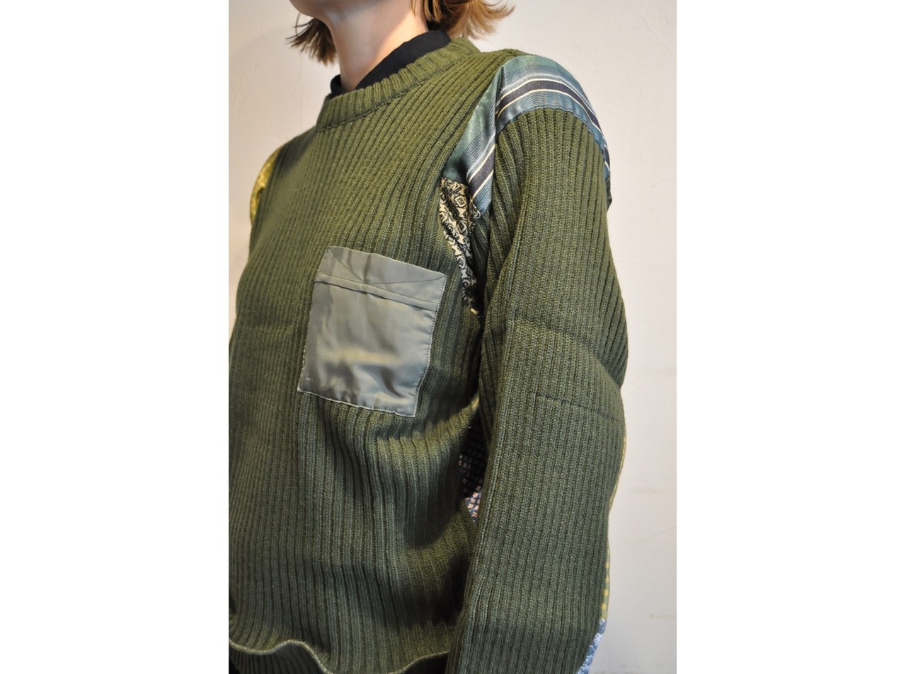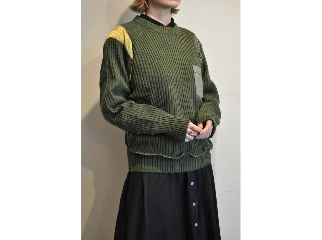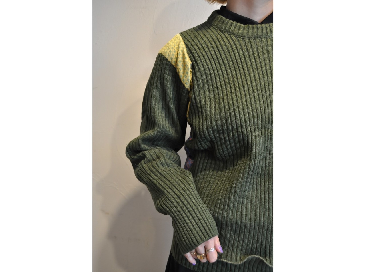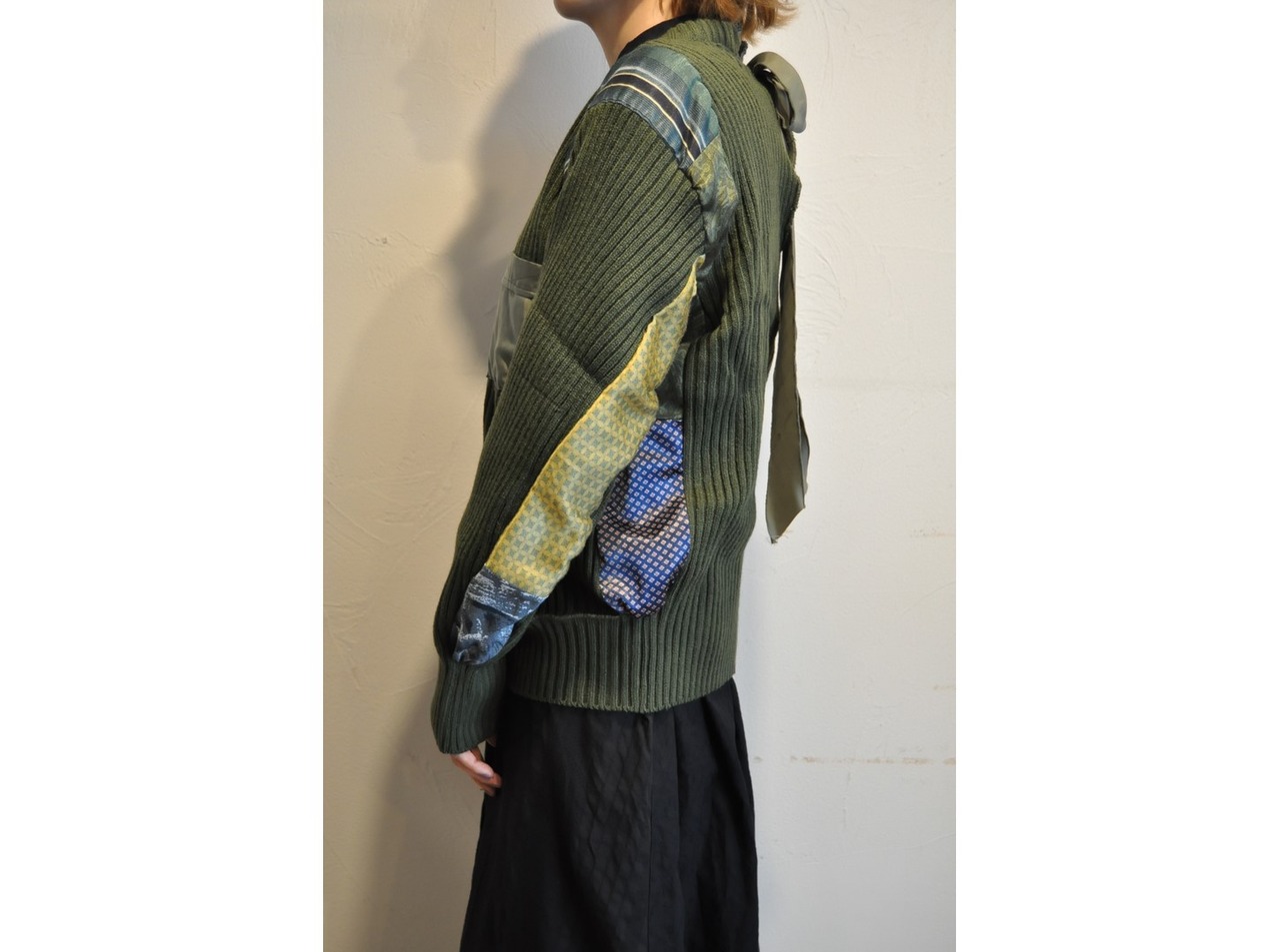 柄の生地の差し込みとリボンによって無骨な軍物セーターも可愛らしい印象になっています。
