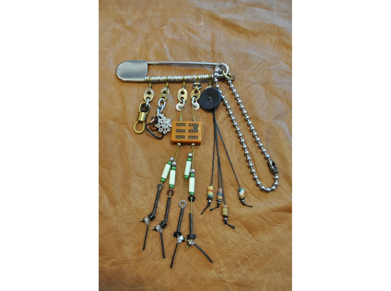 古いベークライトパーツ、オリジナルファブリックのボタン、真鍮パーツなどを使用した存在感のあるシリーズです。