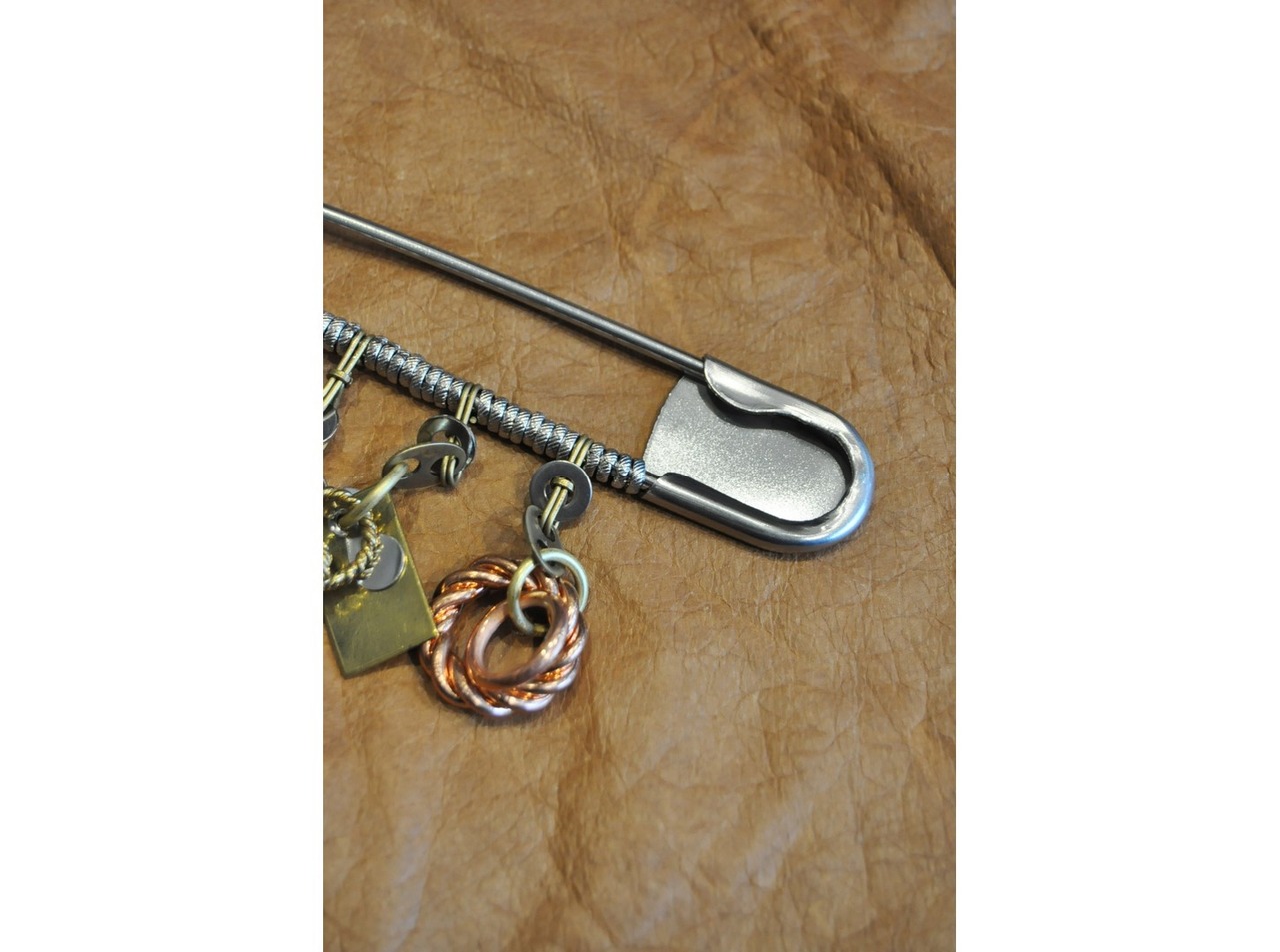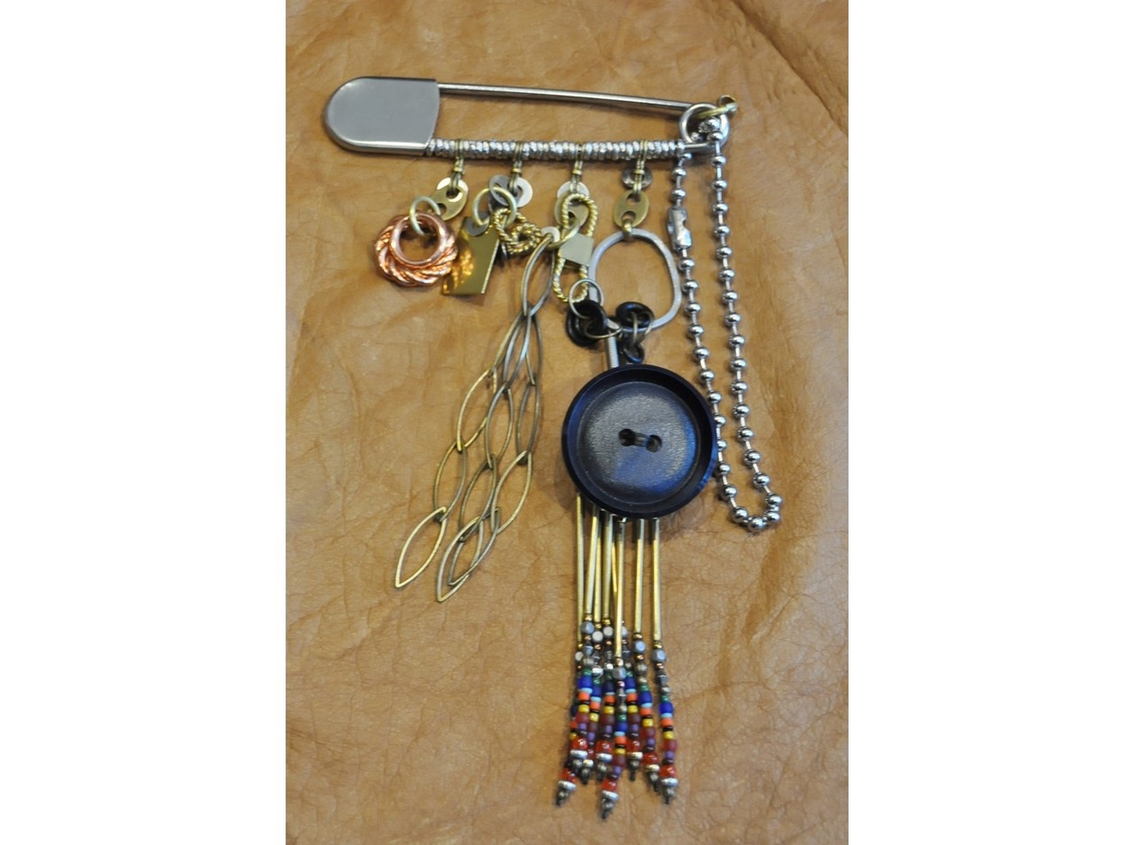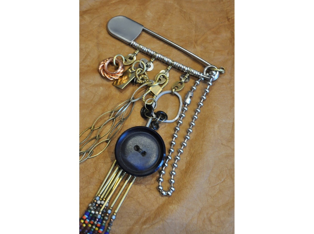 古いベークライトパーツ、オリジナルファブリックのボタン、真鍮パーツなどを使用した存在感のあるシリーズです。