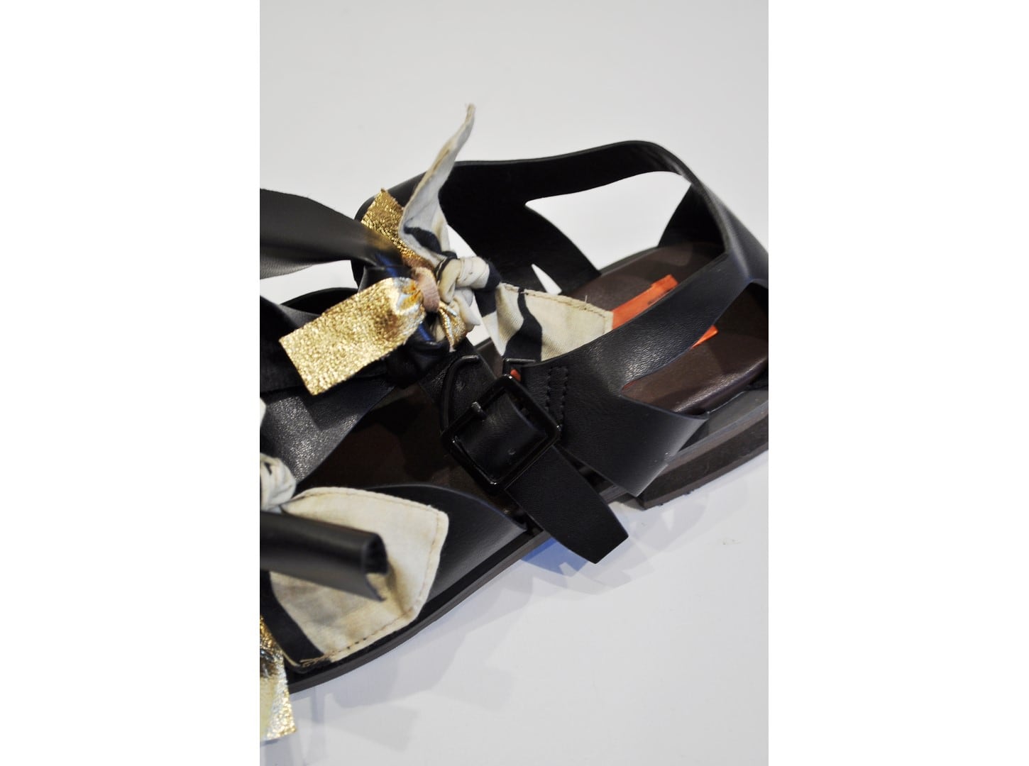 ●ミリタリーのグルカサンダル調のベースに、プリミティブ柄のリボンやメタリックのリボンをボリューミーに結び付けた豪華なサンダルです。