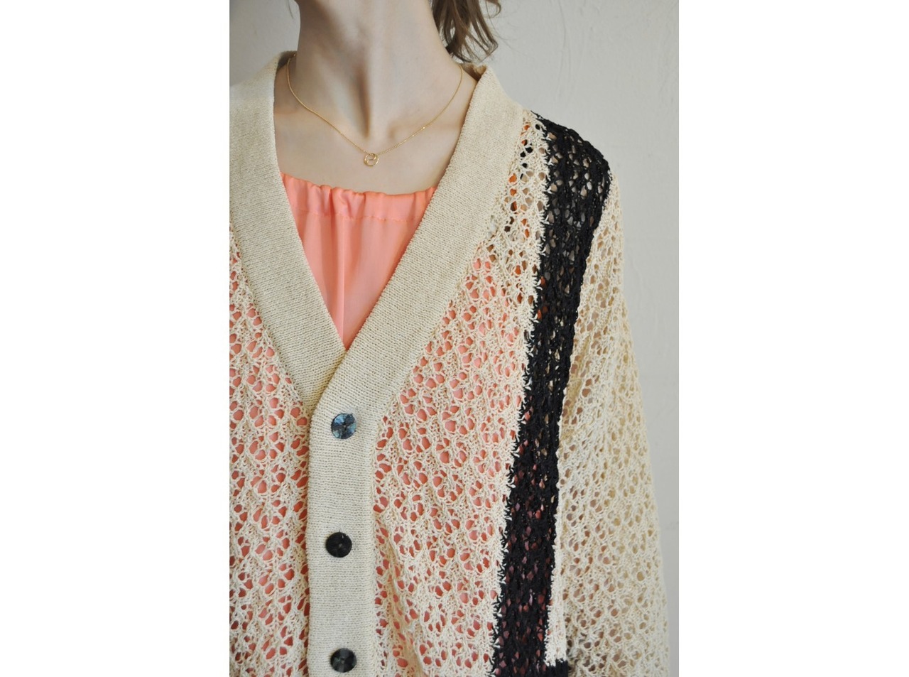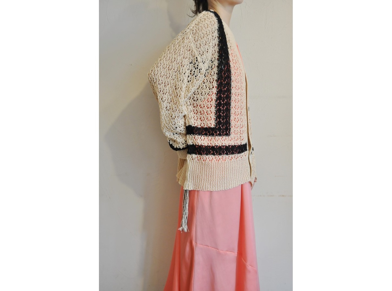●軽く清涼感のある糸を使用しヨーロピアンレースをイメージした透かし柄で編んだカーディガン。