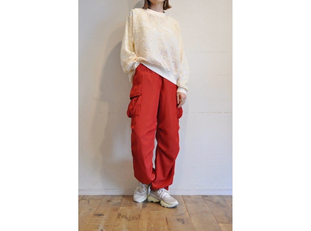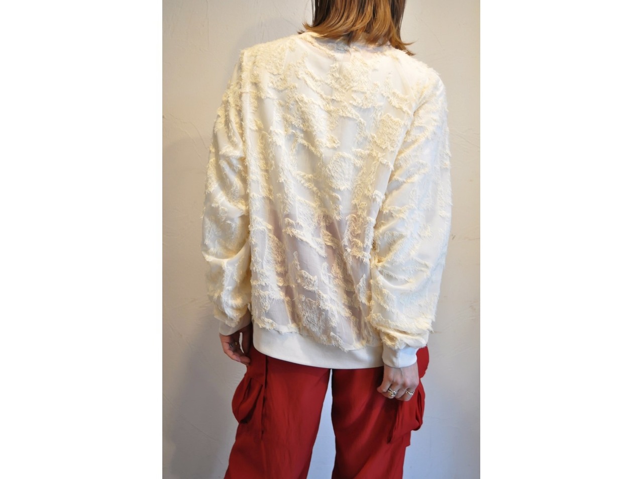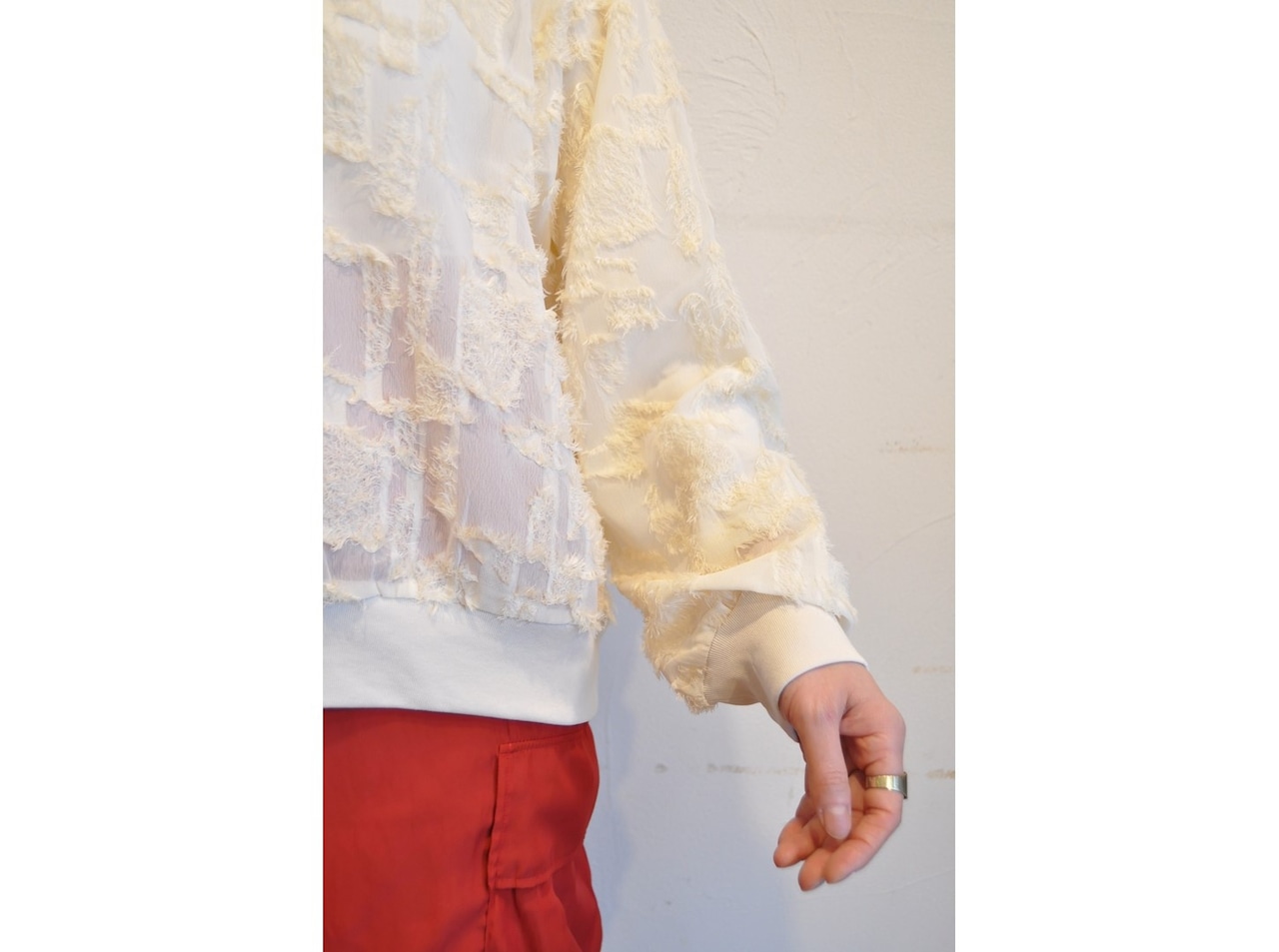 ●浮き立つジャガードと透け感のあるシアー素材でインパクトのあるプルオーバー。