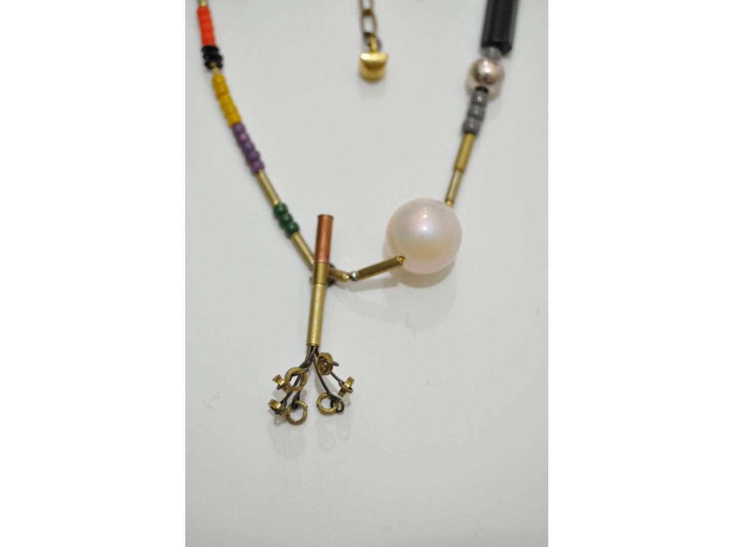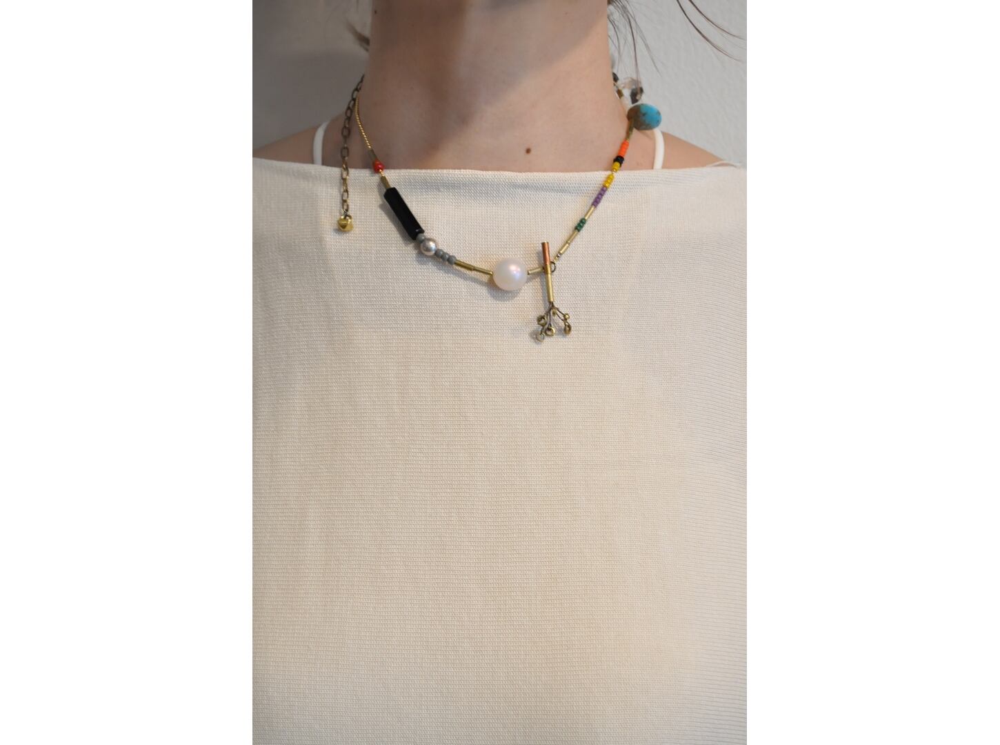 パール、ビース、真鍮など、色々なパーツを使用したデザインです。