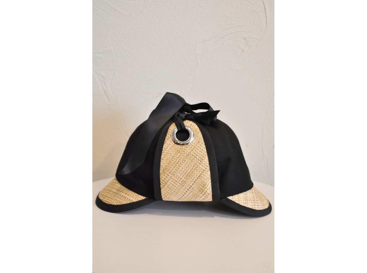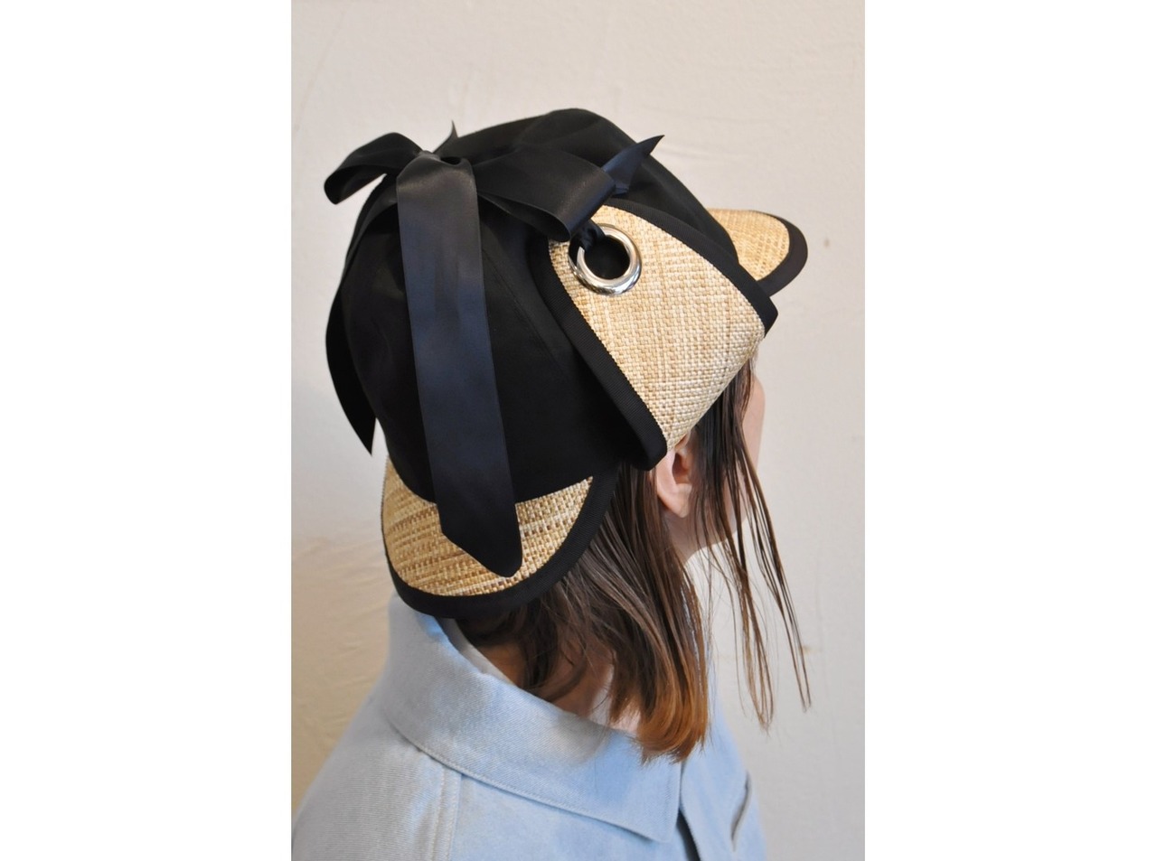 ●麦わらテイストのポリエステル加工生地とコットン生地を使用した帽子。前後どちらでも被れるダブルフェイスデザイン。
