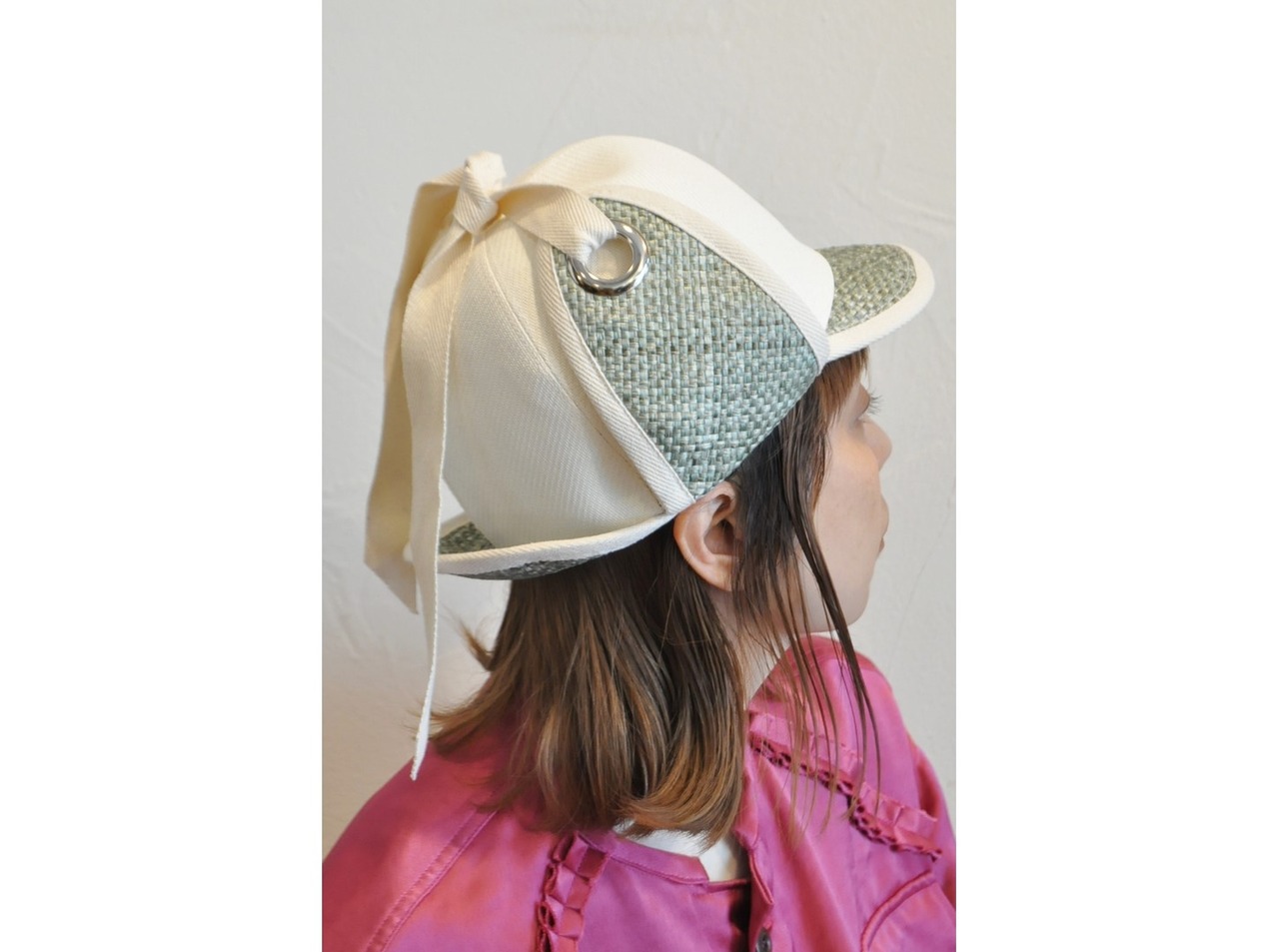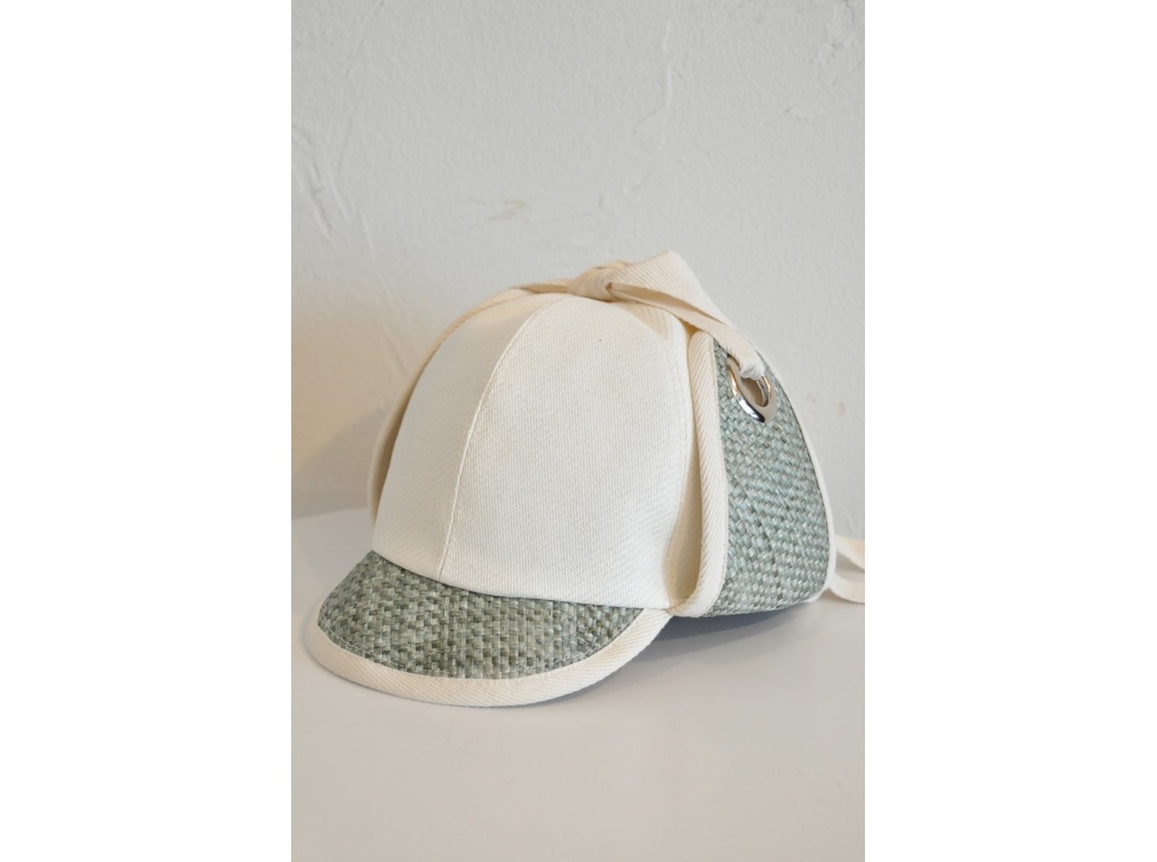 ●麦わらテイストのポリエステル加工生地とペーパー系生地を使用した帽子。