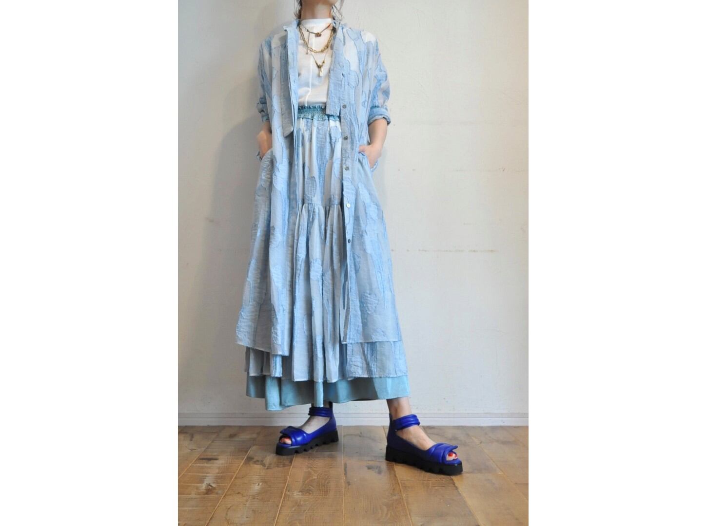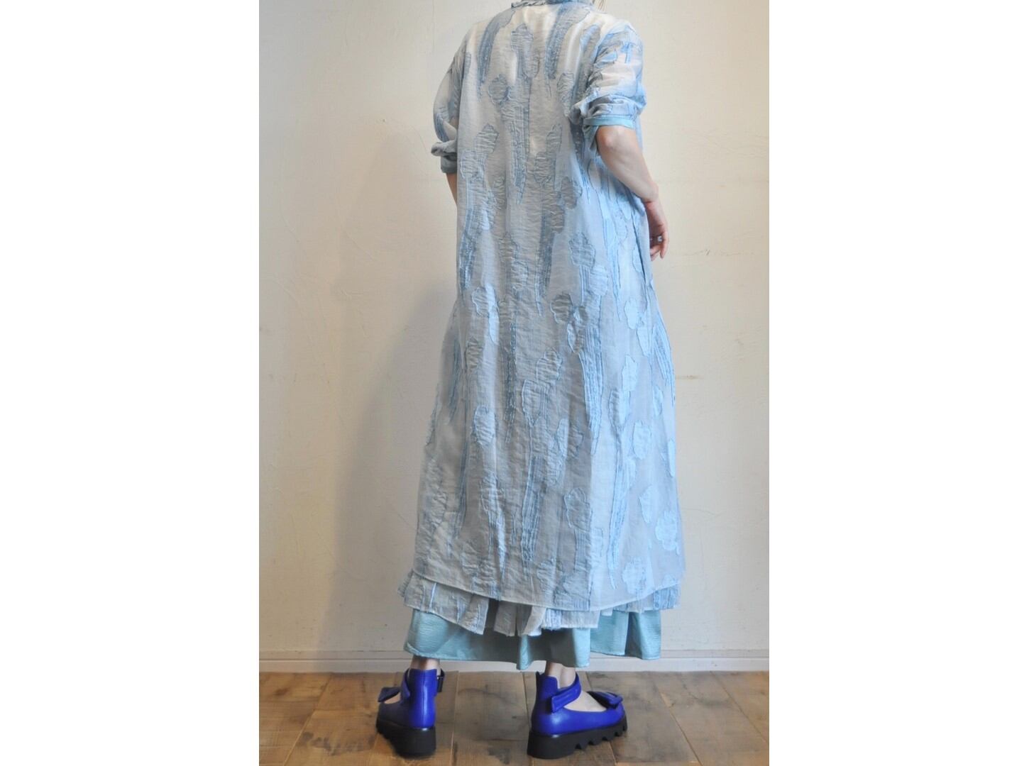 ●シアー感のある美しい織りでリーフ柄になっているテキスタイルを使用した羽織れるワンピース。