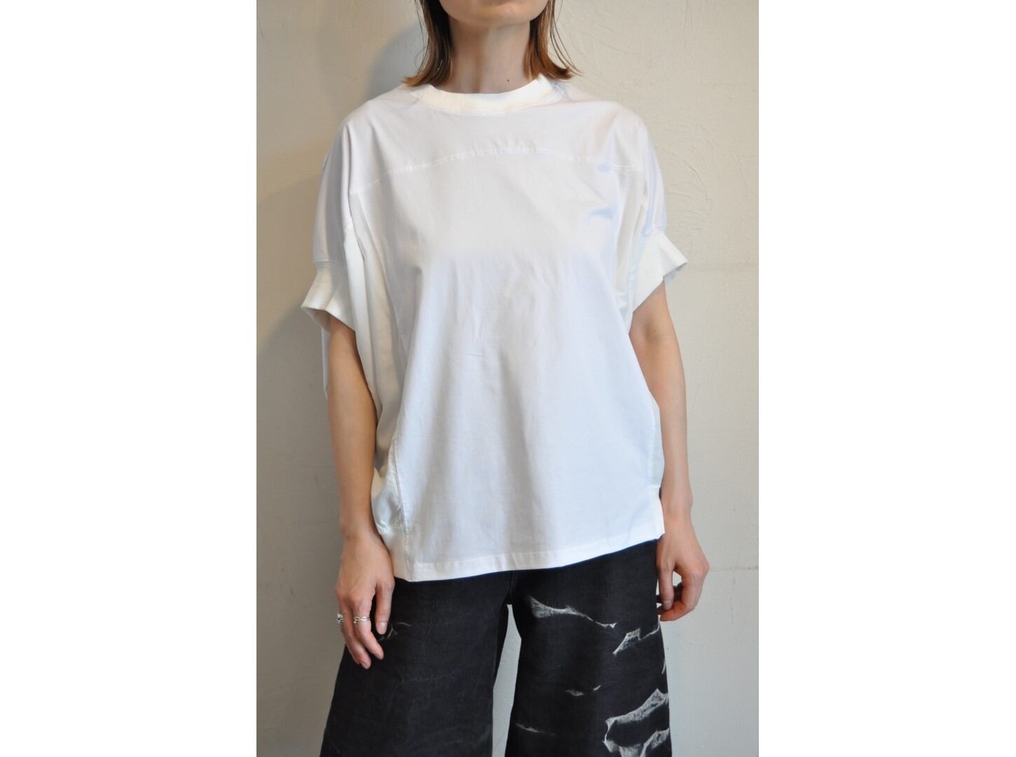 変形したシルエットのTシャツは体型に関係なく着用していただけます。 切り替えが多いデザインを生かして、布帛素材と組み合わせになっています。