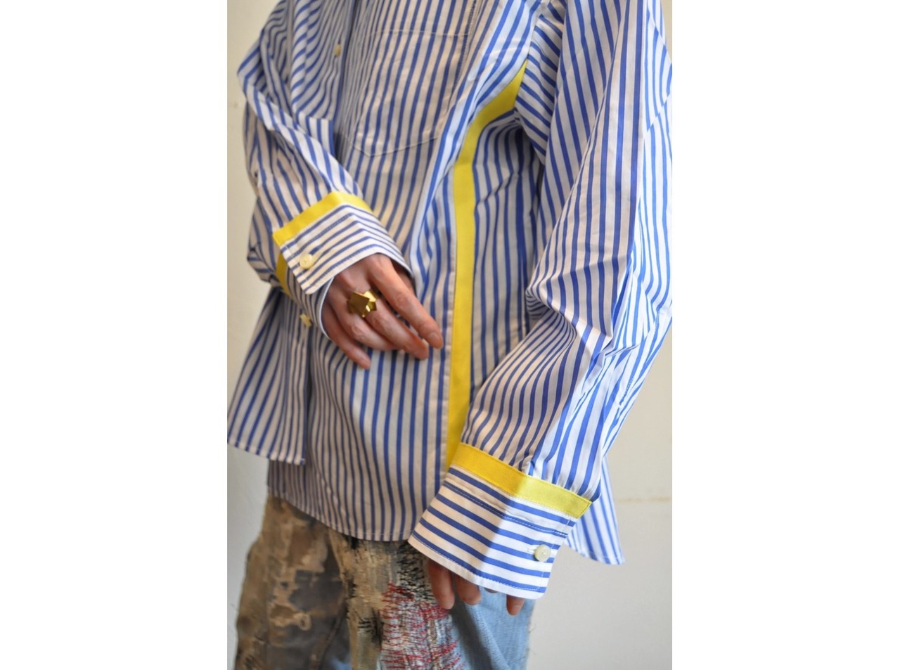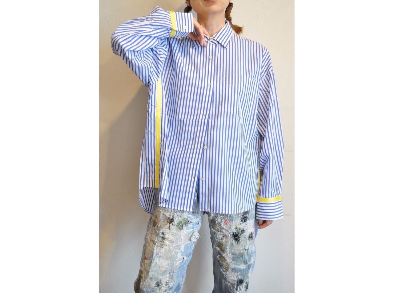 トラッドなストライプシャツの両脇にアクセントになる配色ラインを施し、袖口部分のラインもポイントになっています。