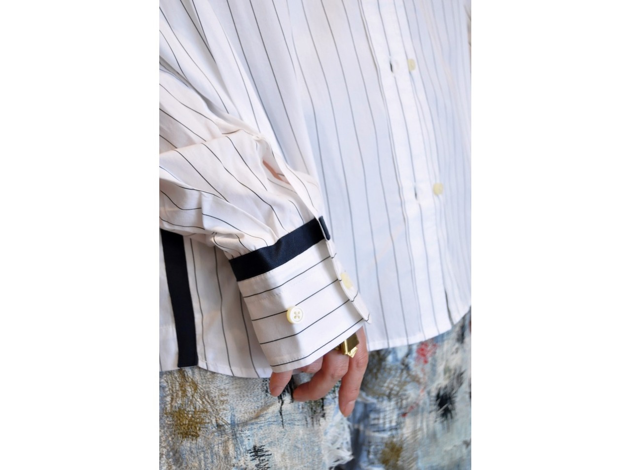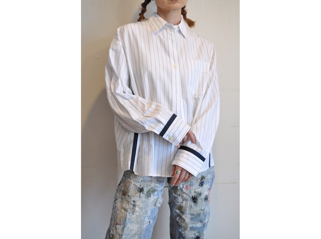 トラッドなストライプシャツの両脇にアクセントになる配色ラインを施し、袖口部分のラインもポイントになっています。