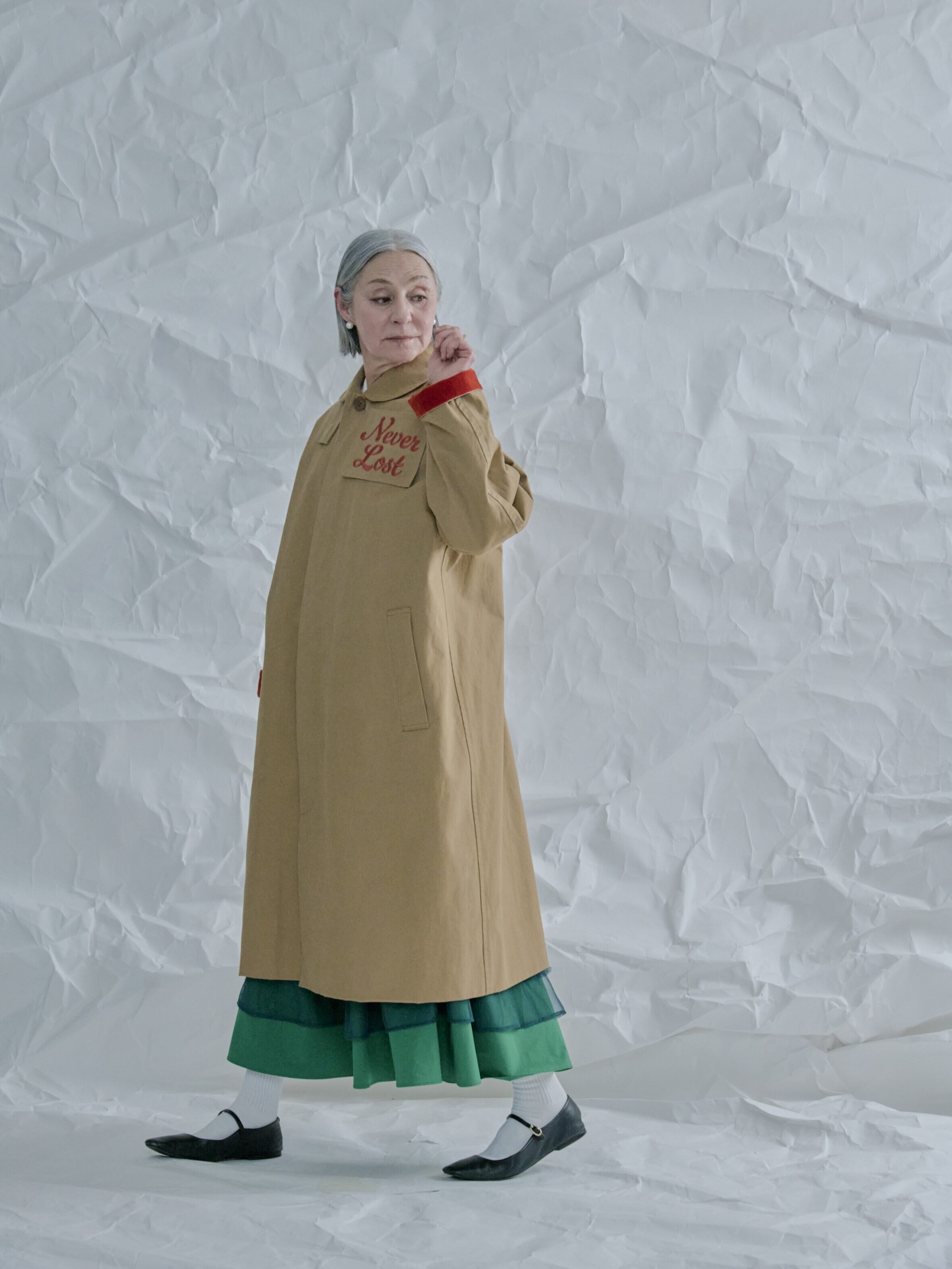 胸にNEVER LOST の刺繍ロゴが入ります。裏地がバスの路線図になっています。本物の路線図をアルファベット表記に変えてテキスタイルを裏地にしています。今回は 君の好きな花 と 西鉄バス とのトリプルコラボレーションです。