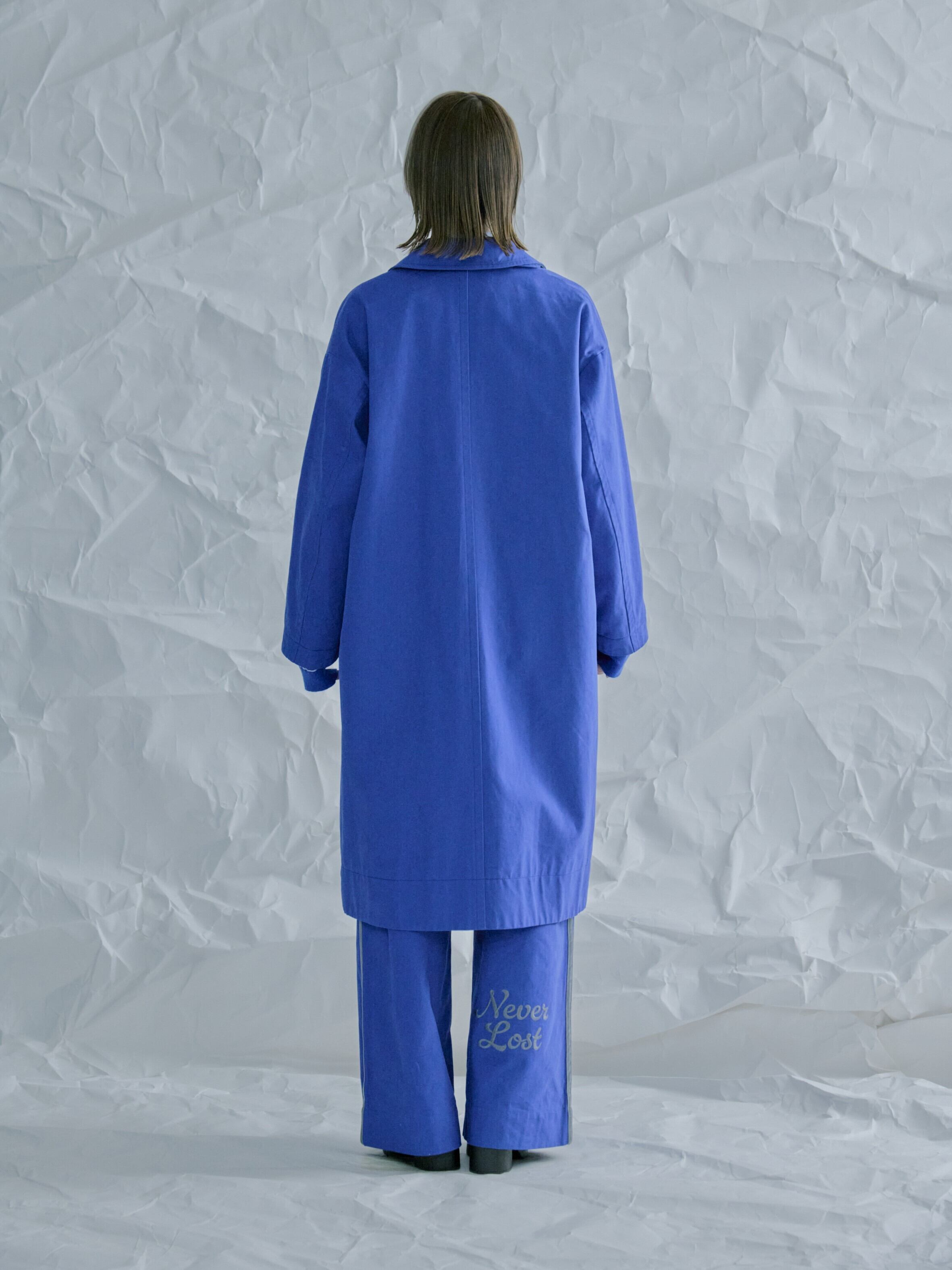 コットン素材のロングコートを作りました。今回は丸い襟がポイントになっています。羽織りやすいコットン素材。着丈は長めで膝下、ふくらはぎあたりになります。長すぎず、軽く羽織れます。真っ青なロイヤルブルー。君の好きな花 のイメージカラーのロイヤルブルーがとても魅力的です。