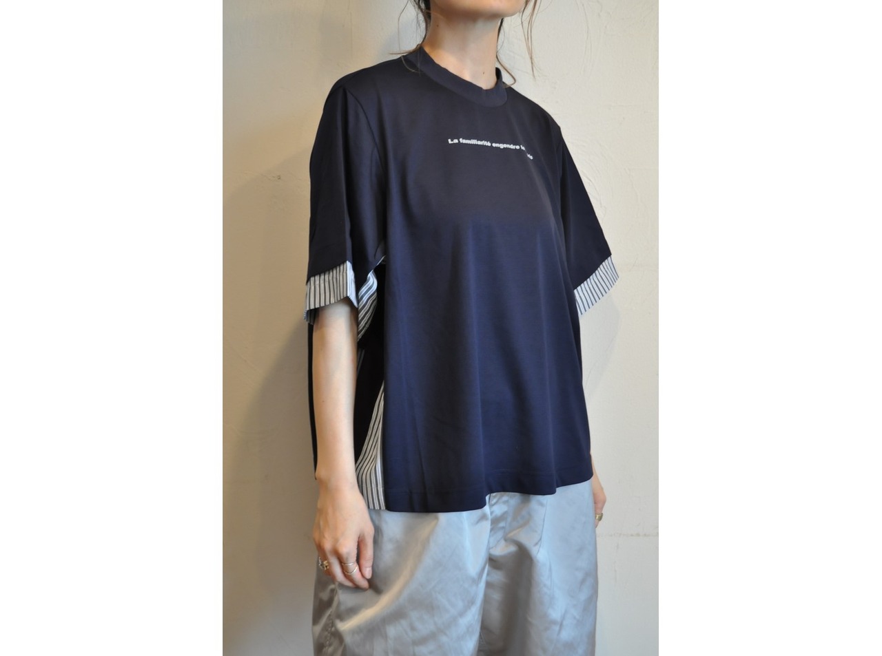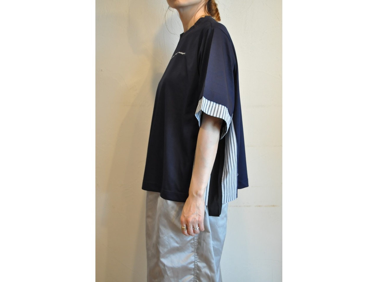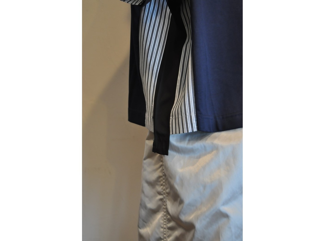 ゆったりとしたシルエットで、両脇から袖にかけてストライプシャツと組み合わせたようなリメイク風のデザインになっています。