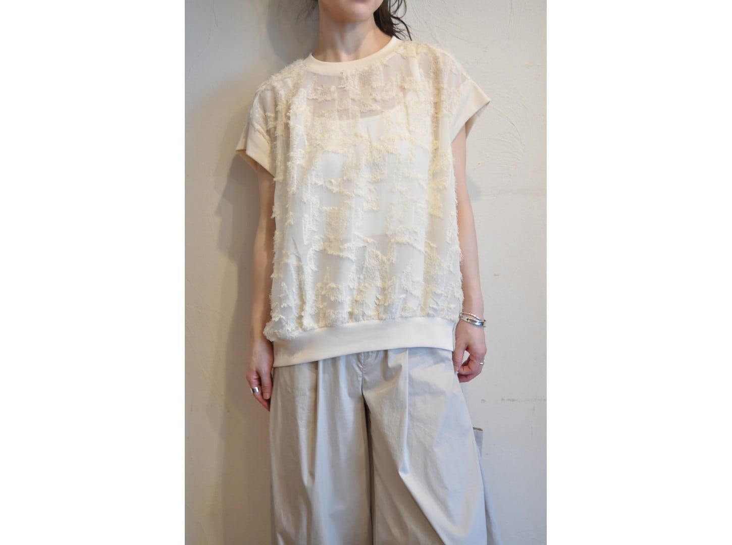 人気のカットジャガードのキャップスリーブプルオーバー。