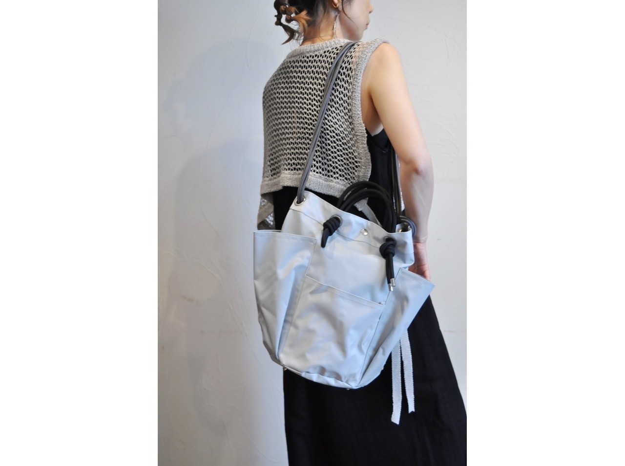 結び目で長さを調整でき、肩がけと斜めがけができる様になっています。