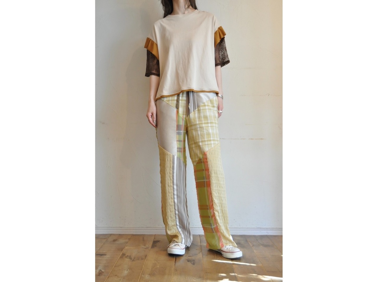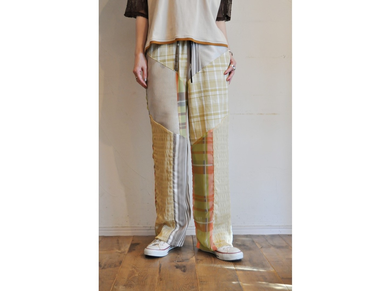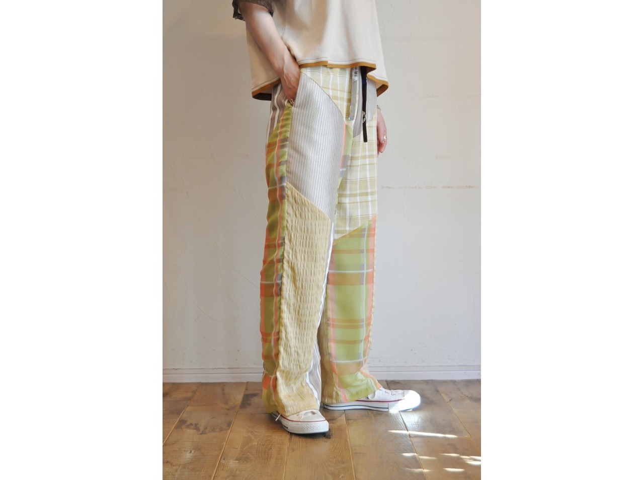 ●定番柄物のパッチワークパンツ。今回は斜めの切り替えパッチワークです。