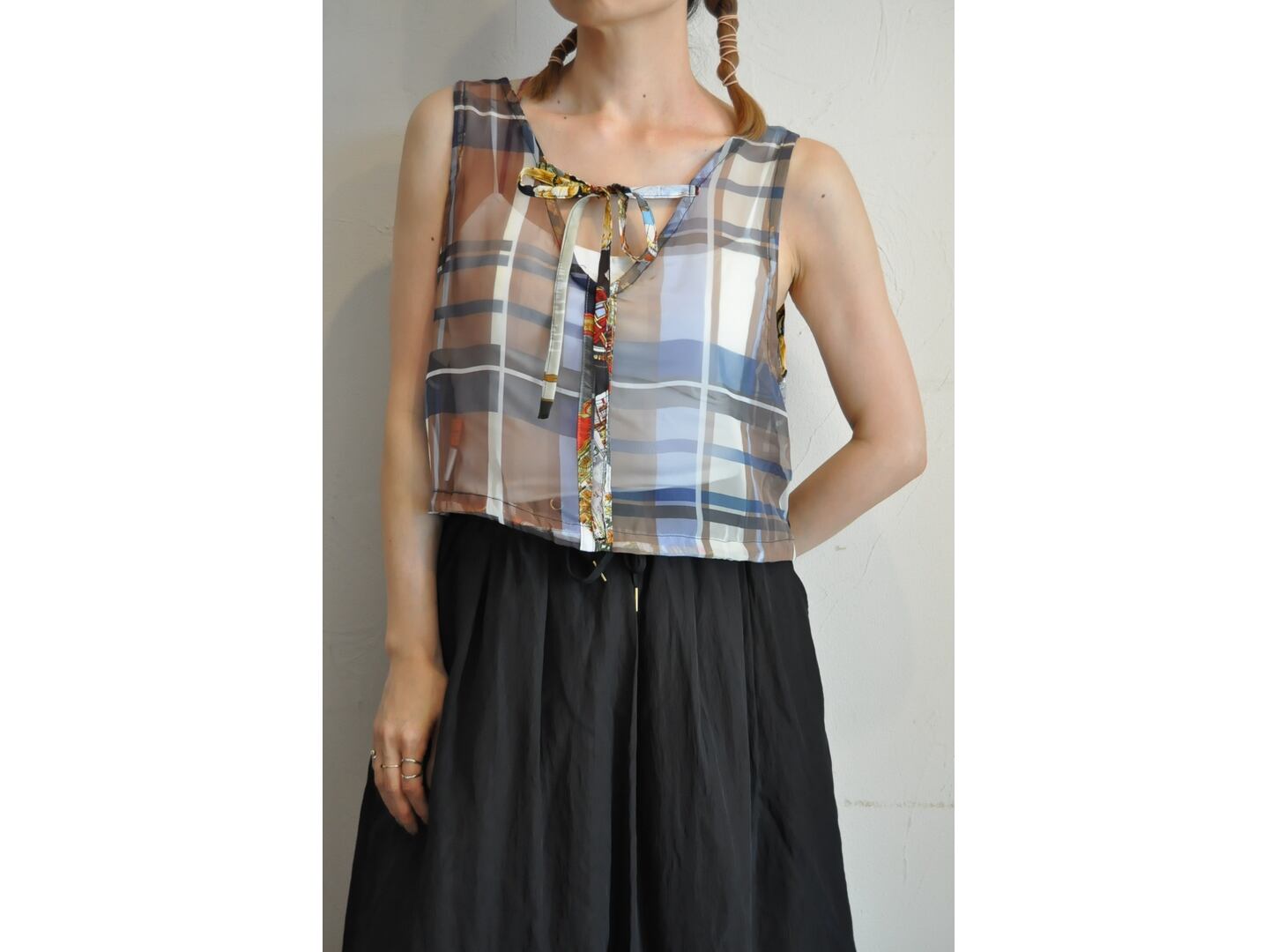 ●フロントは様々な色柄のパッチワーク、バックはシフォンのチェックになったトップス。