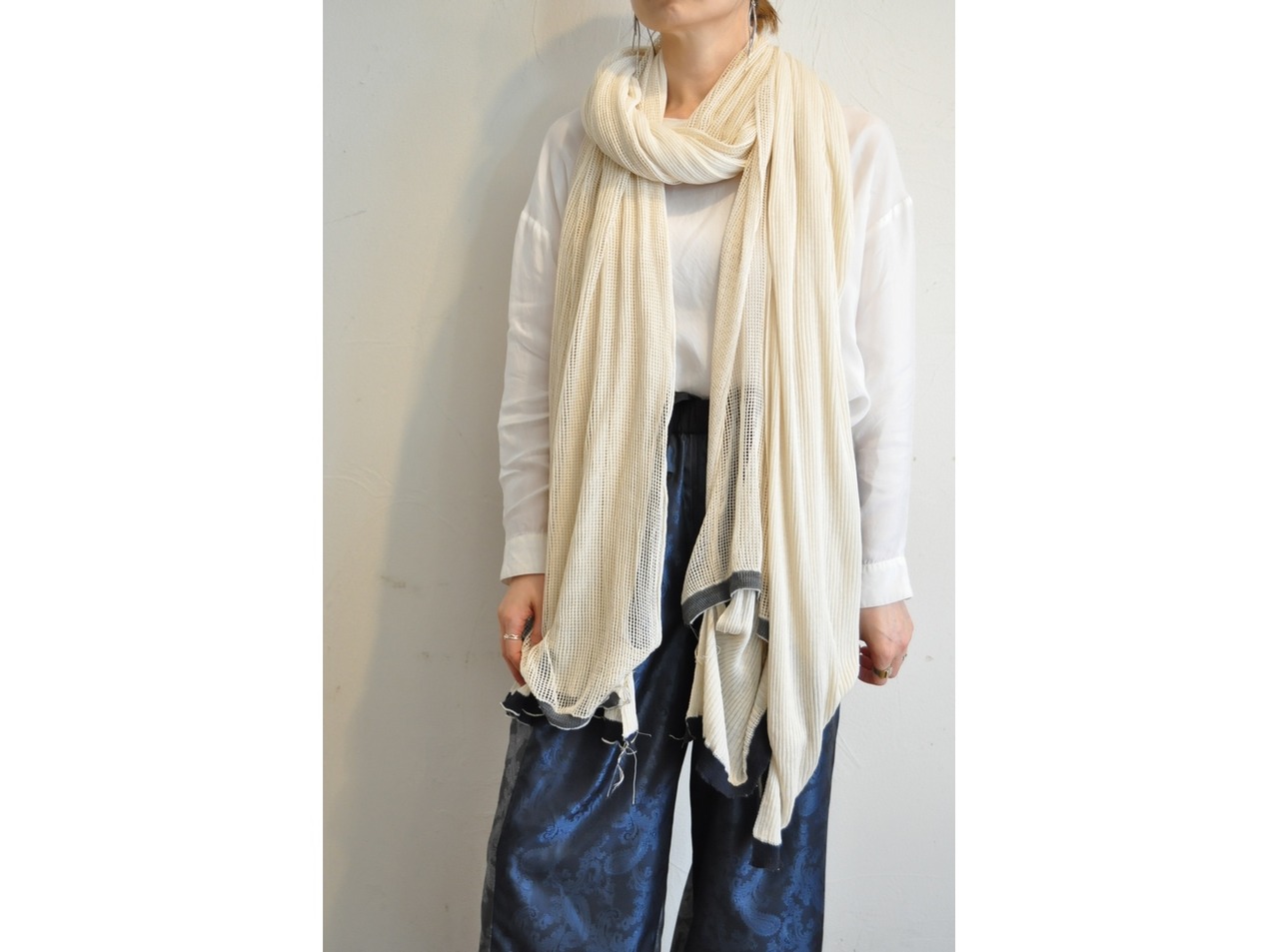 編地の異なるニットを贅沢にも2枚重ねにすることで、巻くだけでなく、被る、羽織るを実現。