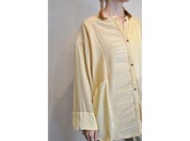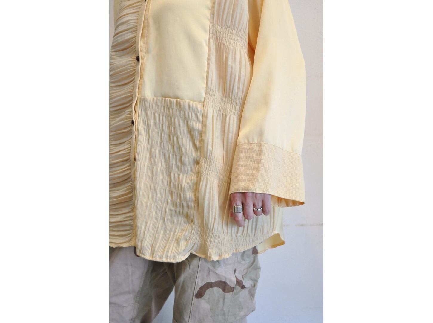 ●異素材生地をパッチワークで仕上げたオーバーサイズのノーカラーシャツ。
