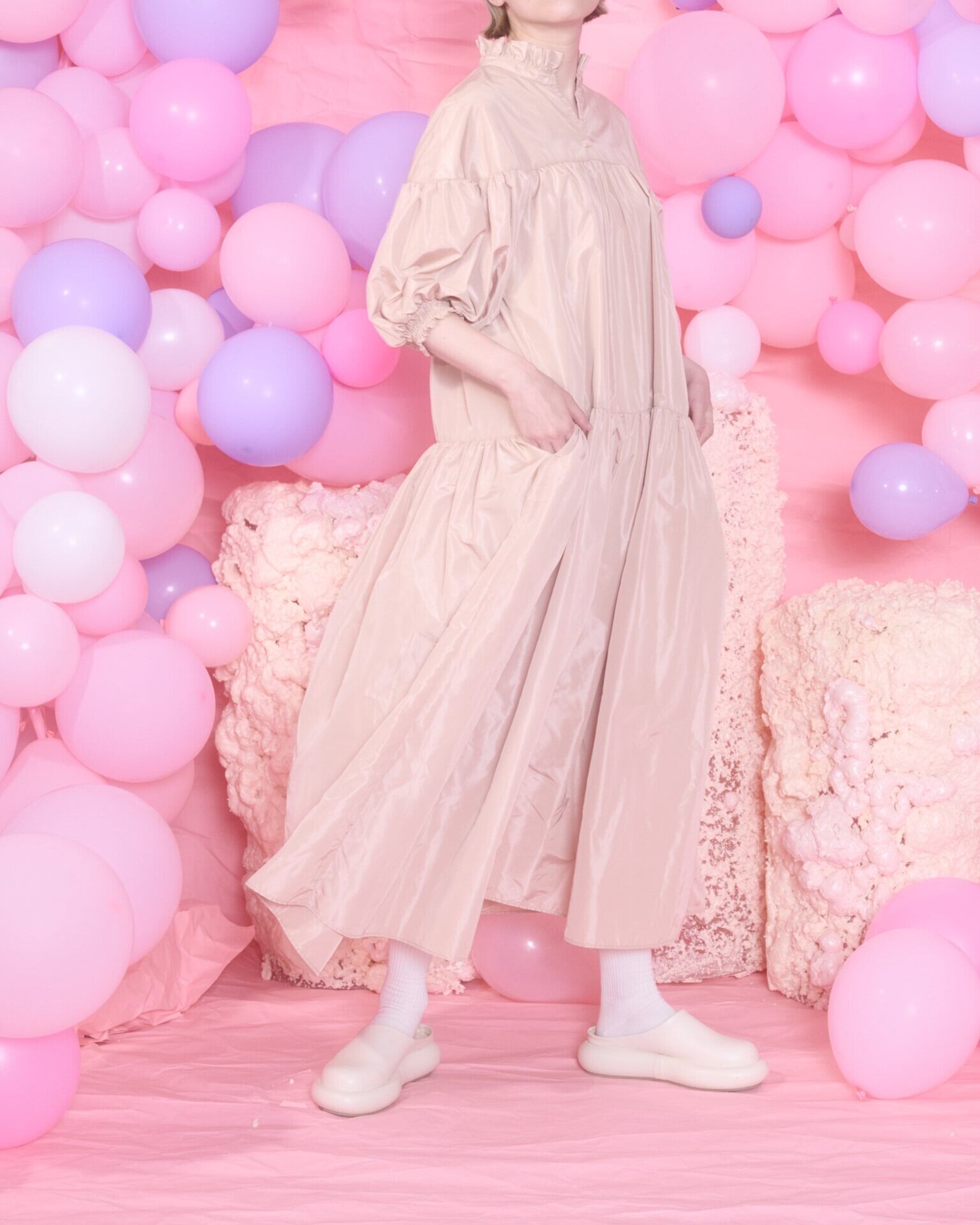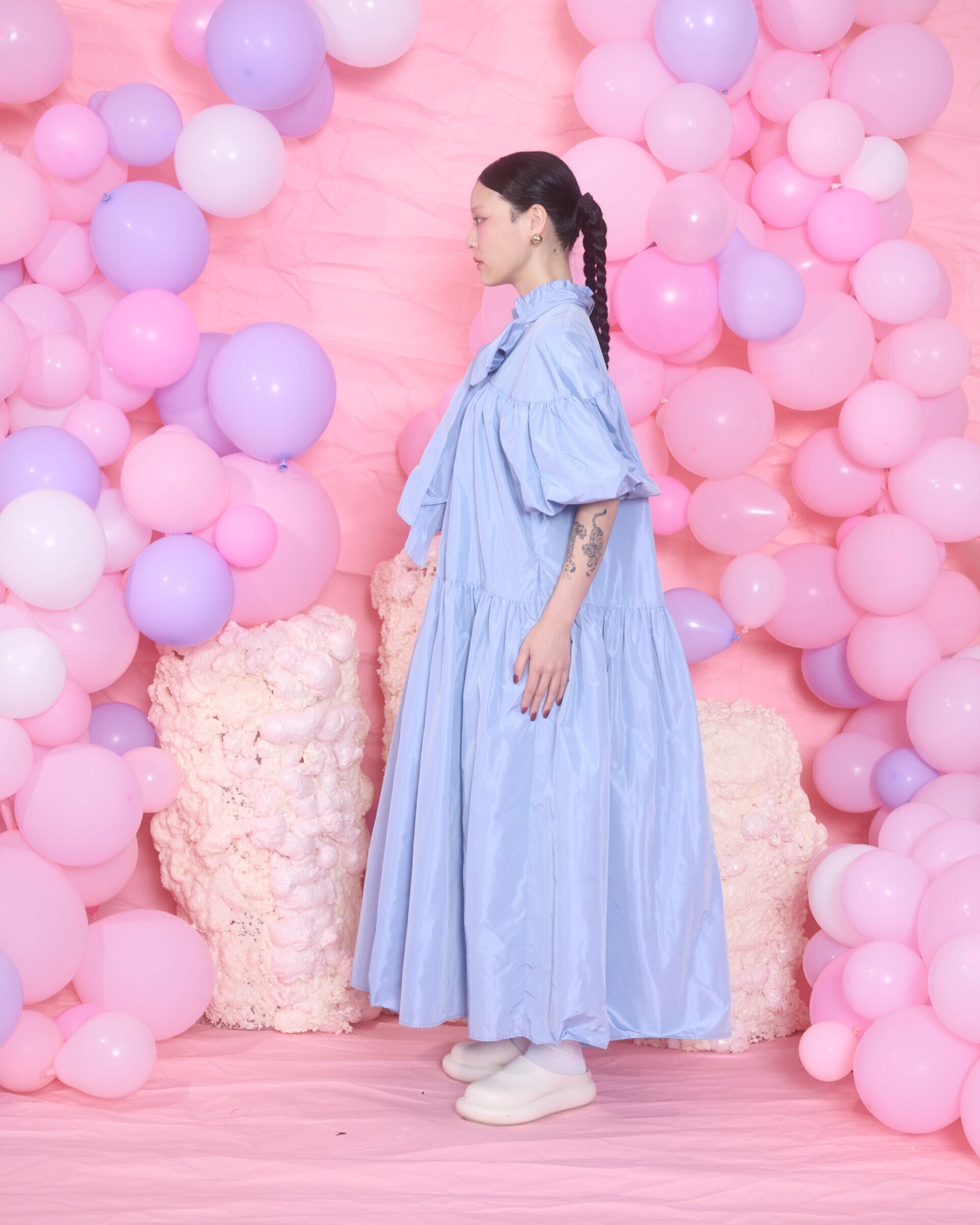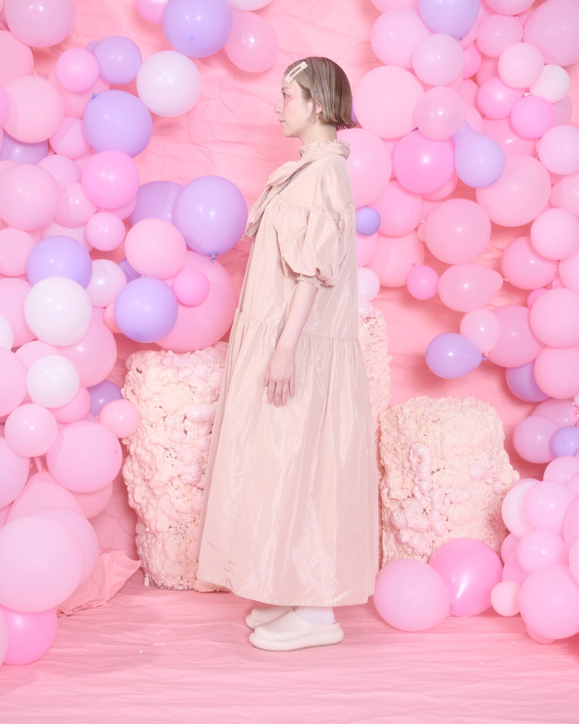 今回のパフスリーブドレスはツヤのあるタフタ素材。形状を記憶する柔らかくてハリのある素材を探しました。かなり長い間探して、見つけた理想の素材です。なぜこの素材にこだわったかというと、襟元にあるリボンとパフスリーブ部分にハリと膨らみを持たせたかったからです。特にこのリボンの形状が保てるのはこの素材ならでは。一度リボンを整えると崩れる事がなくきれいに見せてくれるのでとても気に入っています。