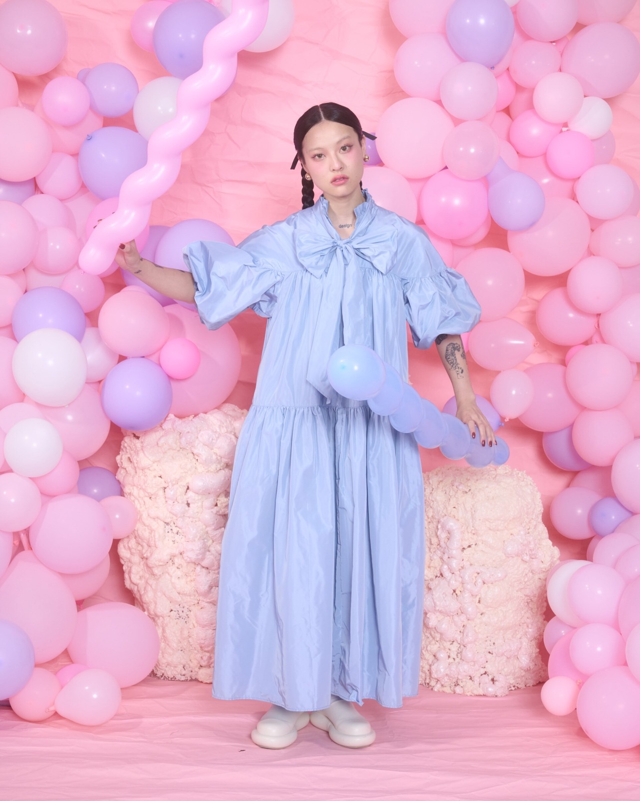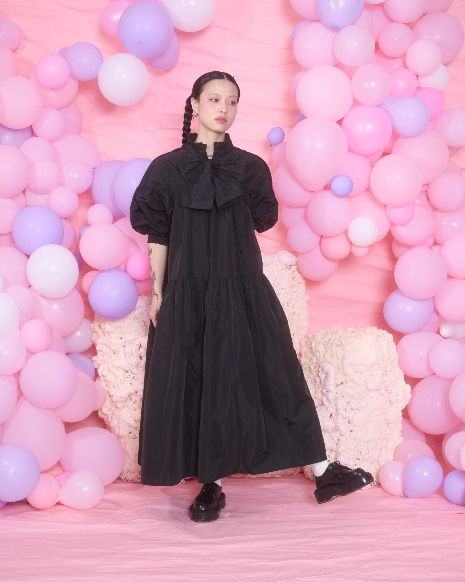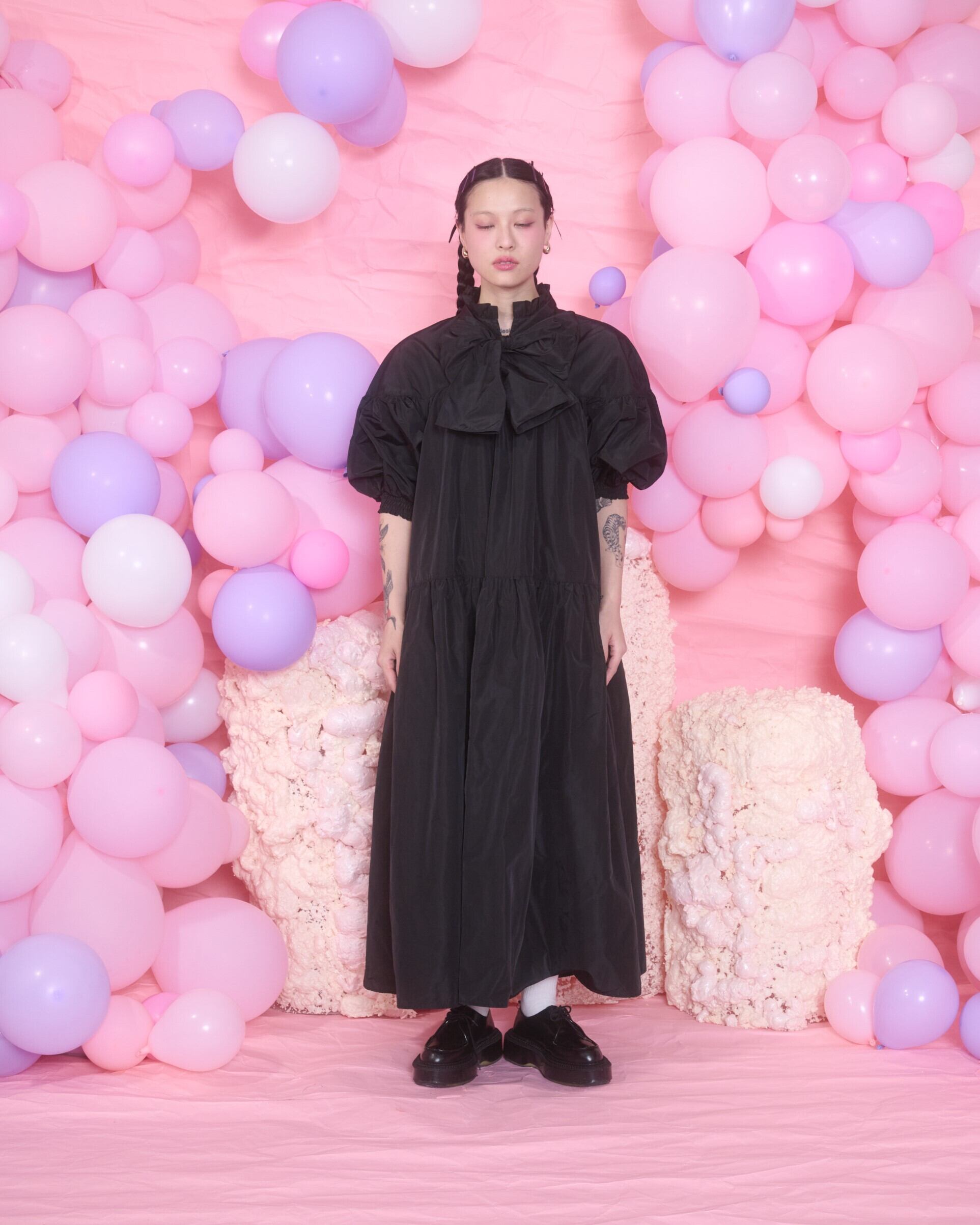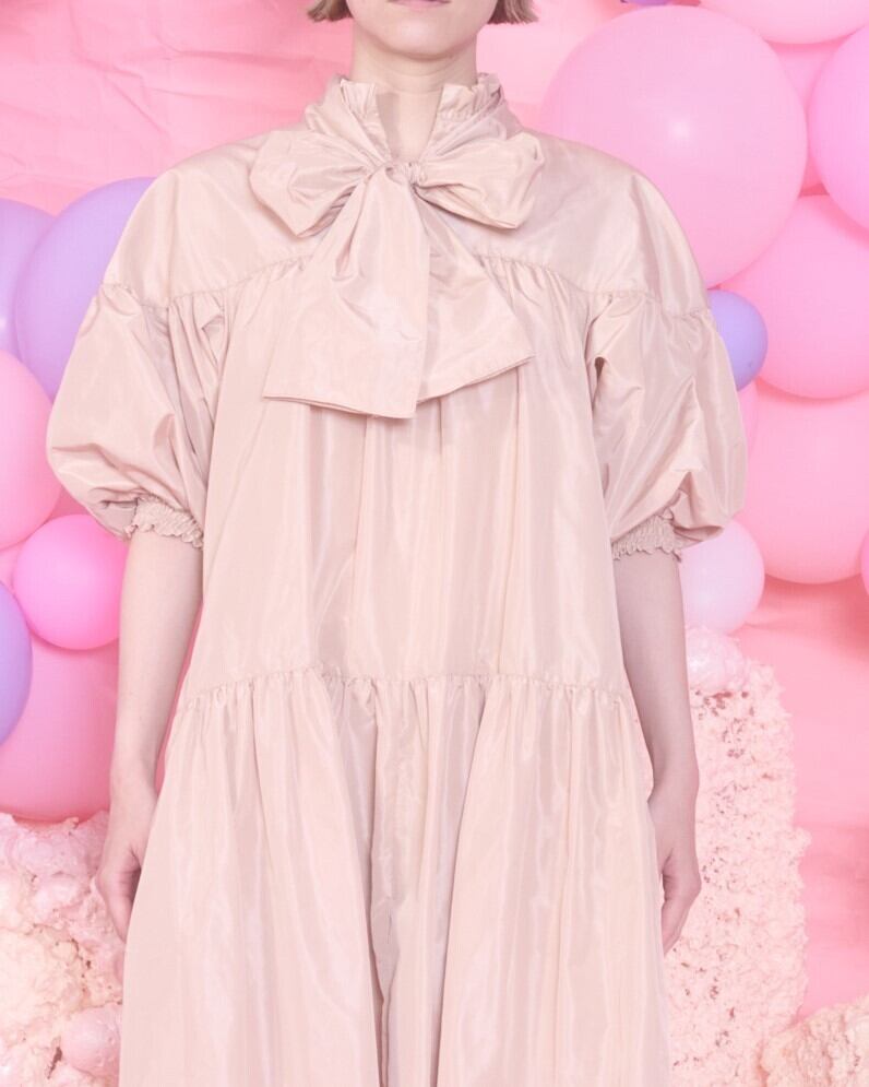 今回のパフスリーブドレスはツヤのあるタフタ素材。形状を記憶する柔らかくてハリのある素材を探しました。かなり長い間探して、見つけた理想の素材です。なぜこの素材にこだわったかというと、襟元にあるリボンとパフスリーブ部分にハリと膨らみを持たせたかったからです。特にこのリボンの形状が保てるのはこの素材ならでは。一度リボンを整えると崩れる事がなくきれいに見せてくれるのでとても気に入っています。