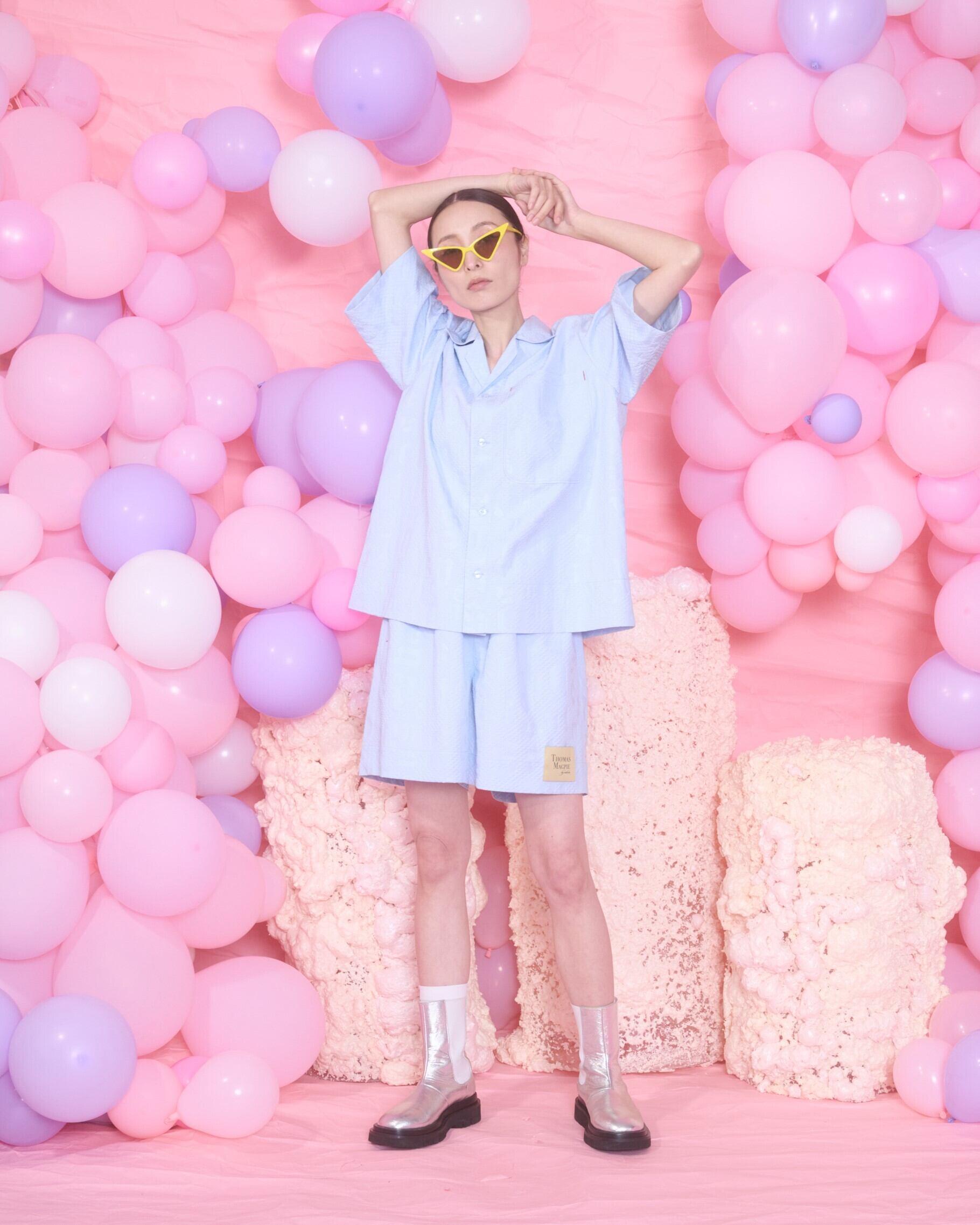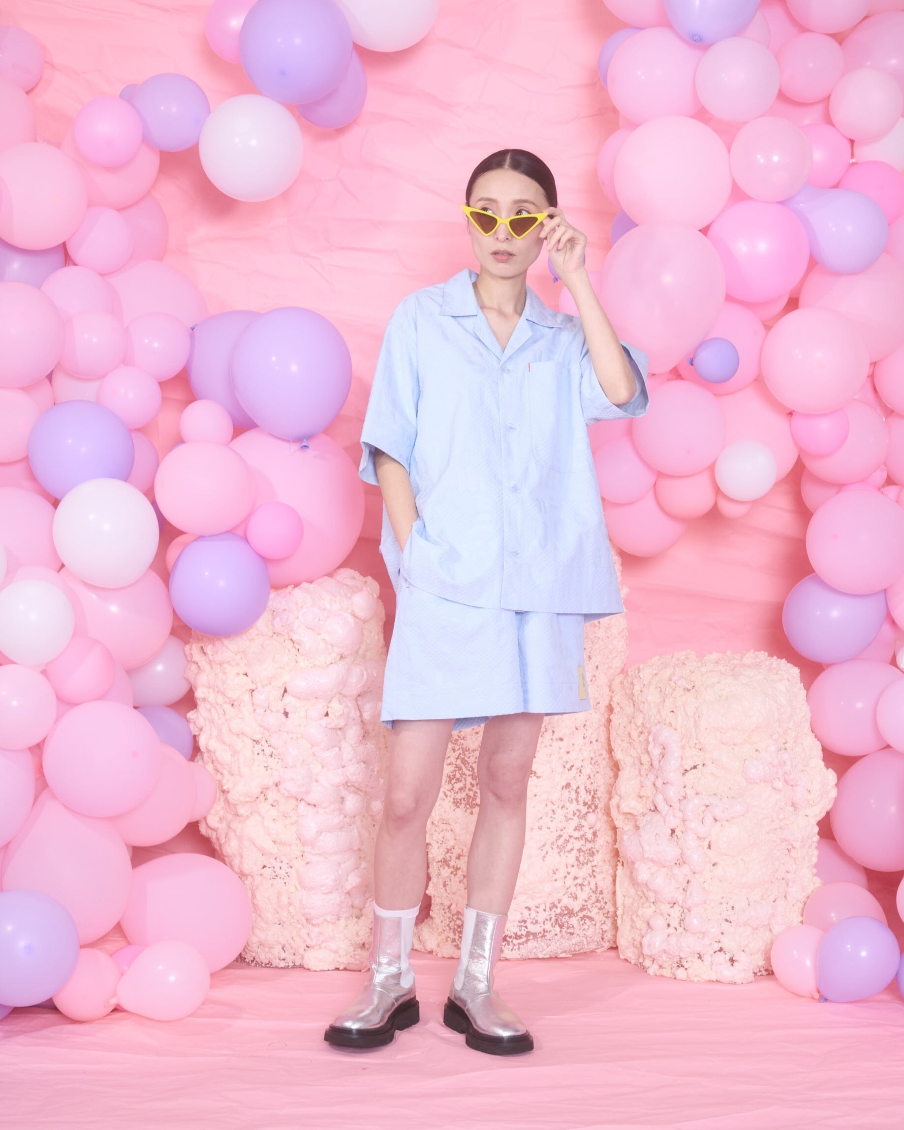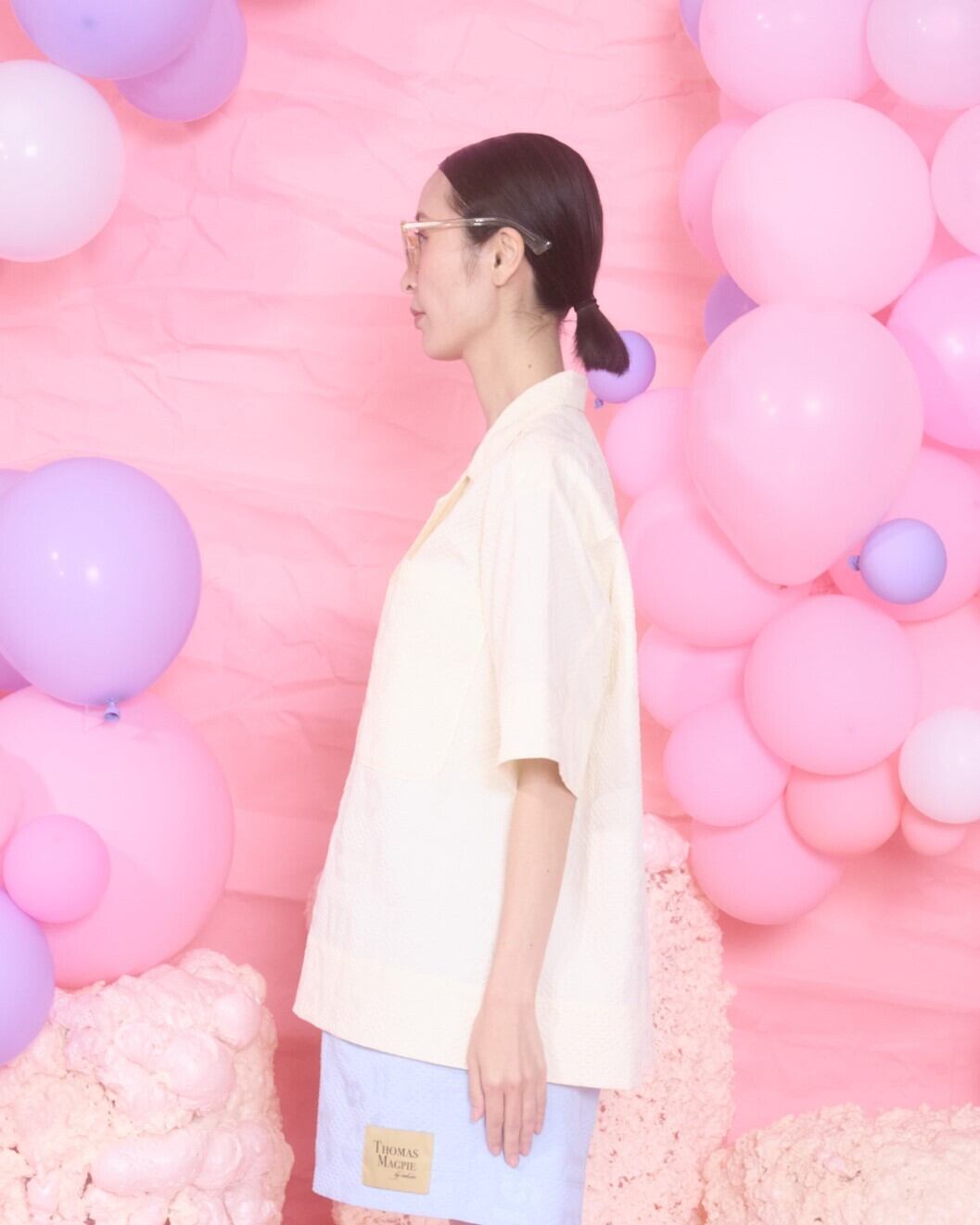 たまたま見つけたエンボス加工の凹凸が新鮮なテキスタイル。このテキスタイルで、甘いドレスはありきたりかもしれないと思い、私が夏によく着ている開襟シャツを考えてみました。