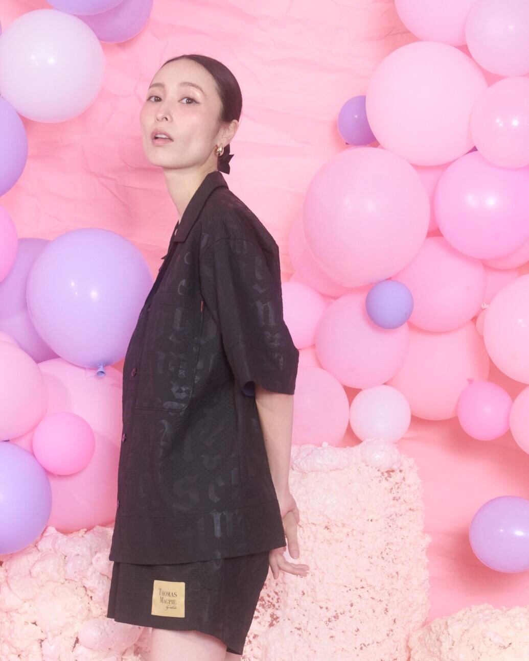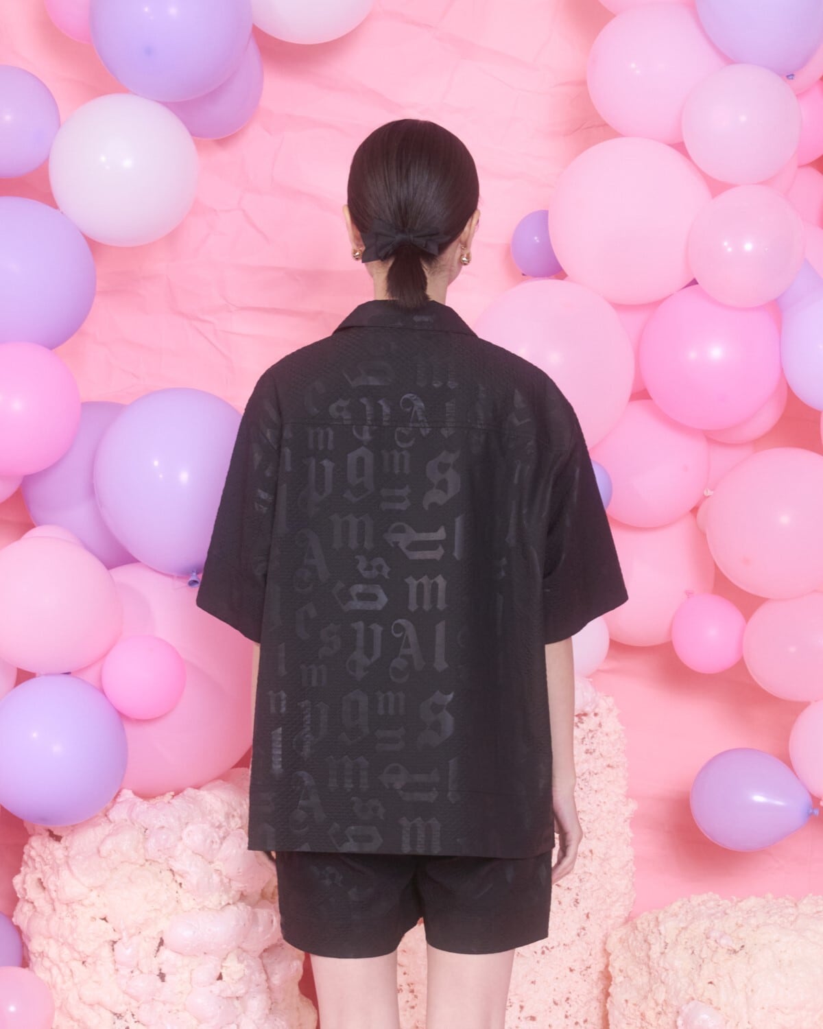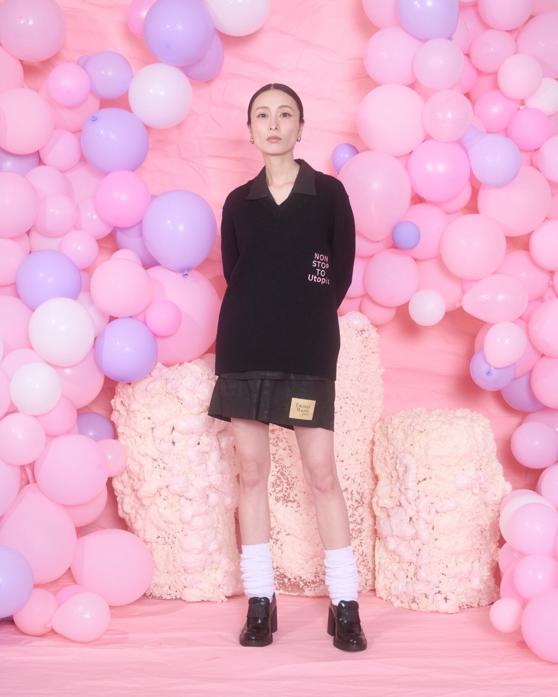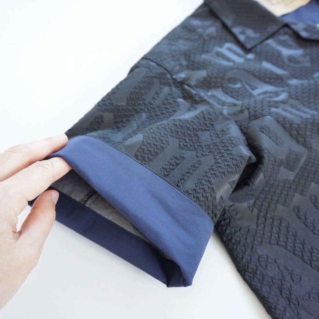 エンボスの加工はアルファベットが入っていてとても珍しいデザイン。とてもアーバンな雰囲気で、また未来的な素材だなと感じました。今回のテーマ、近未来の理想郷、ユートピアという言葉に近しい素材のイメージだったのでピックアップしました。マットで、光沢の無い素材ですが、ビニール加工されたような未来的な素材に見えます。素材はポリエステルで、扱いがしやすく、お洗濯も可能です。