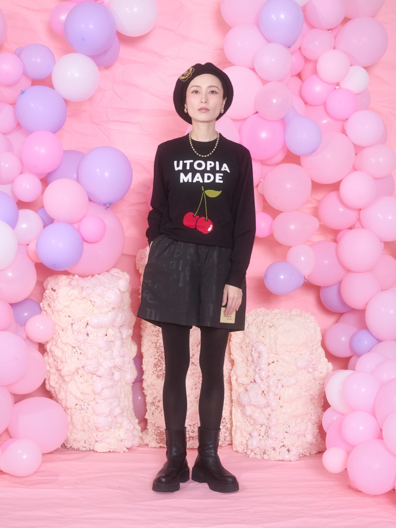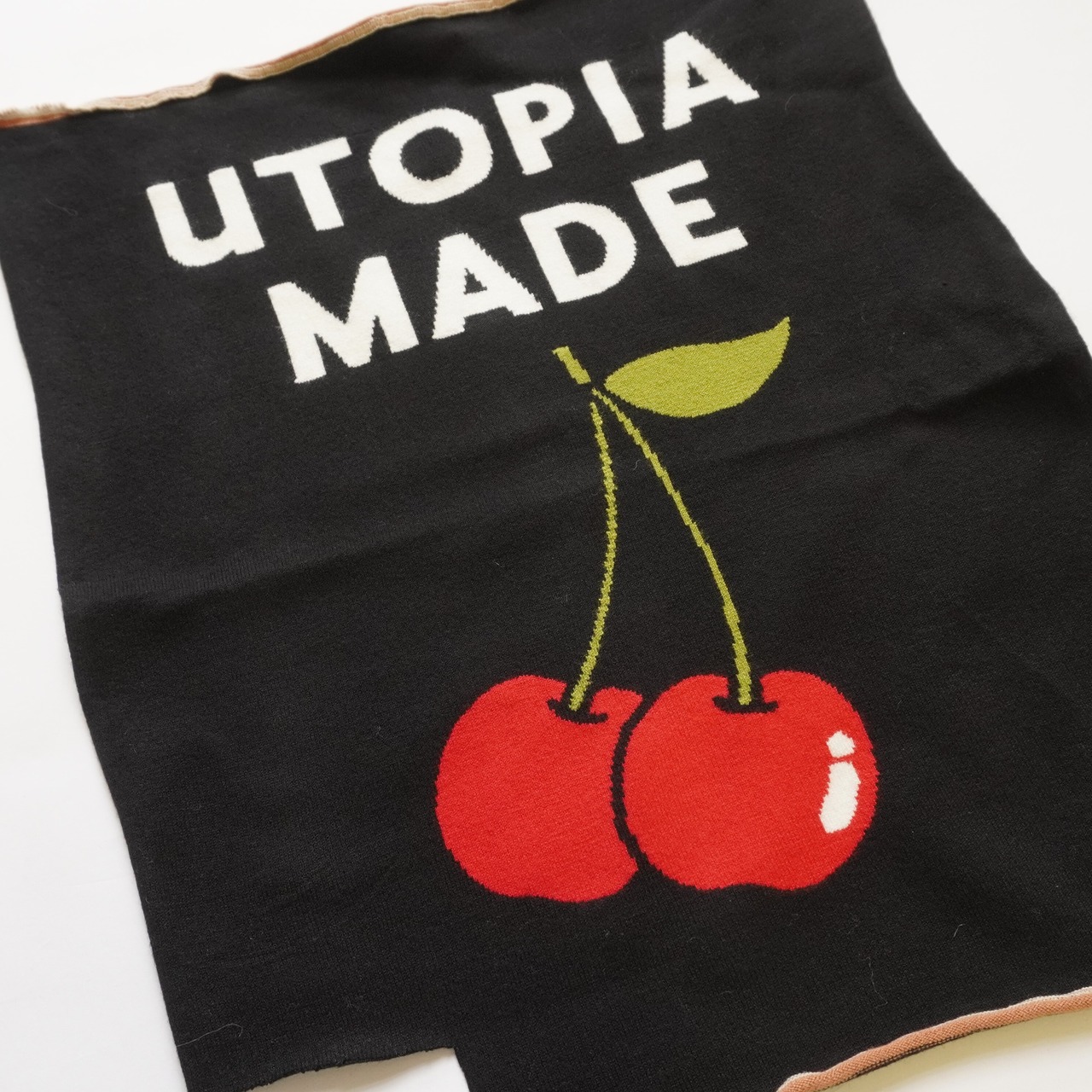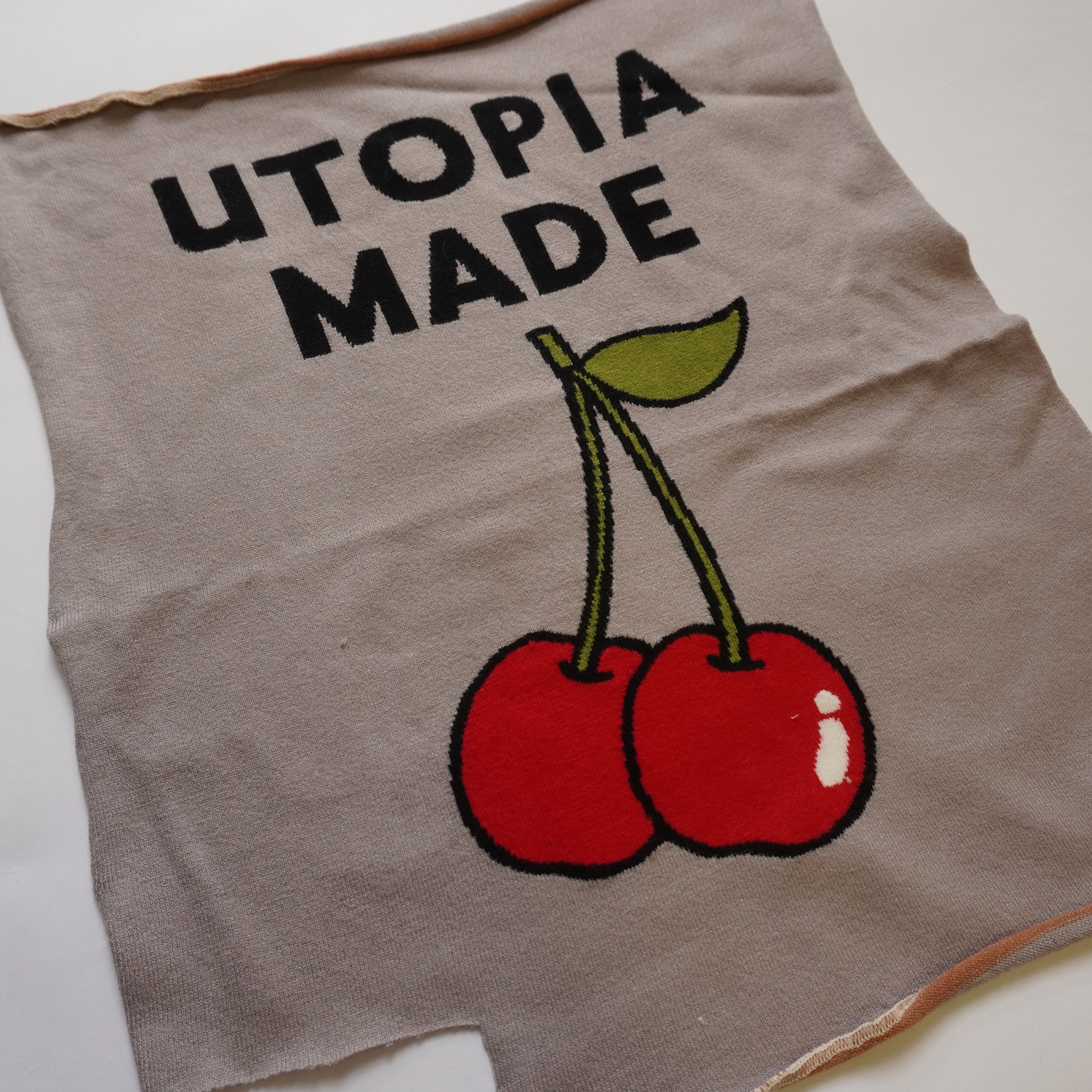 ユートピアで作られたチェリーの絵を描いて入れています。今回のユートピアのイメージは理想郷に入っていきたい、ストレスのない世界なんてないだろうけれどもそんな世界が未来にできたらいいな、という思いからこの言葉を選んでいます。トマスモアのユートピアが16世紀に一番最初に出版され、この言葉が初めて使われました。それはおそらく歴史の授業で知った言葉でした。私なりのユートピアのイメージは今回のコレクションのメインビジュアルになっています。ふわふわとした心地よい世界。イメージを伝えカメラマンとモデルに写真で表現してもらいました。ユートピアでできたチェリーはとても美味しい。このさくらんぼはユートピアでできたものです。さくらんぼの花言葉は”良心”です。心の声に耳を傾け、誠実に行動する精神、善良な教育、上品さ、幼いピュアな心、というものがあるそうです。みんなが良心という心で人々に接することができれば世界はきっと心地よいものになるのだろうな、なかなか出来はしないけど。という理想を表現しています。また現実的にはきっと出来ない、でも精神の世界で理想郷に入れたらいいな、という私自身の妄想でもあります。ベージュとブラックの2色展開。私はブラックがお勧めです。