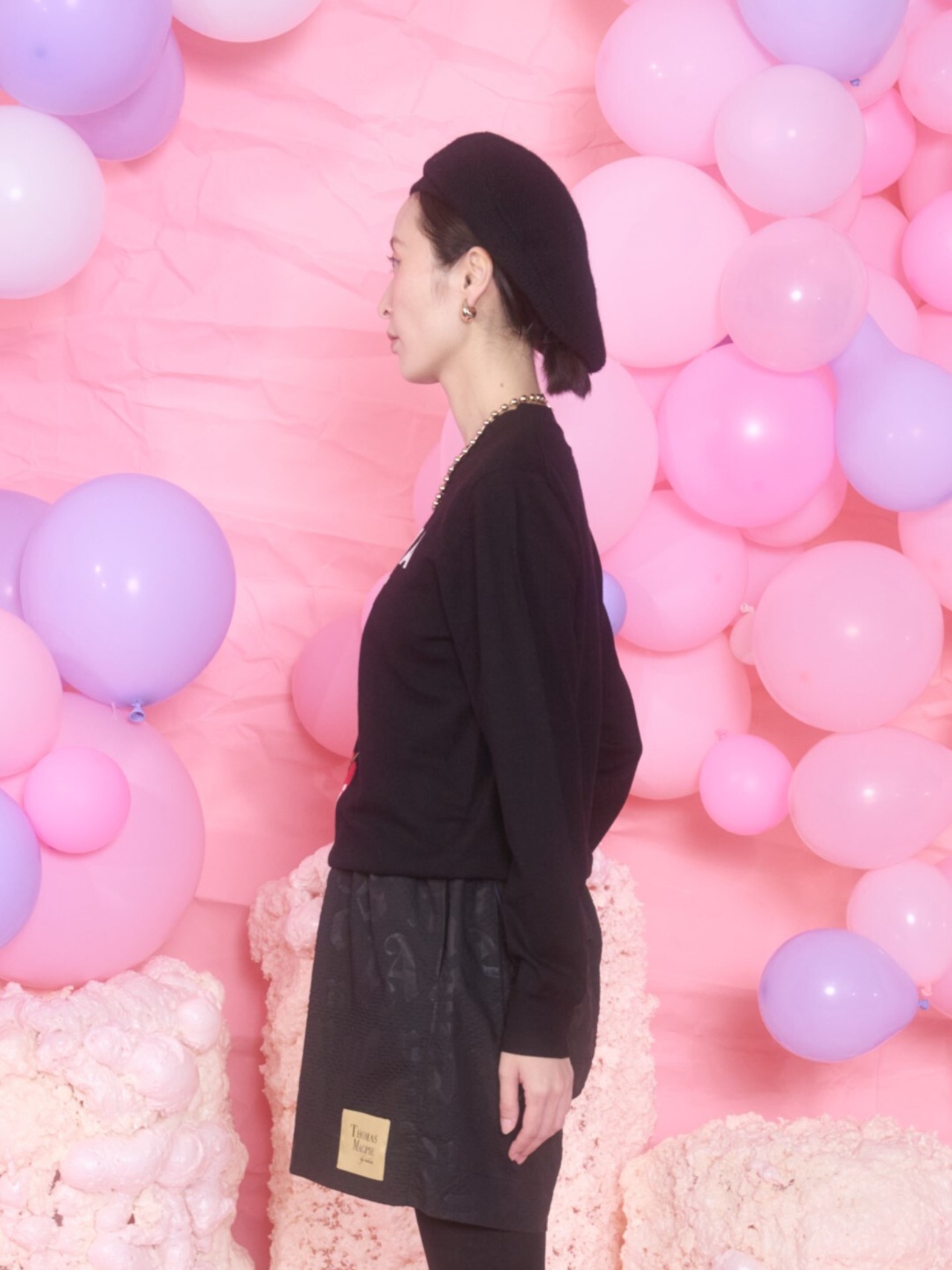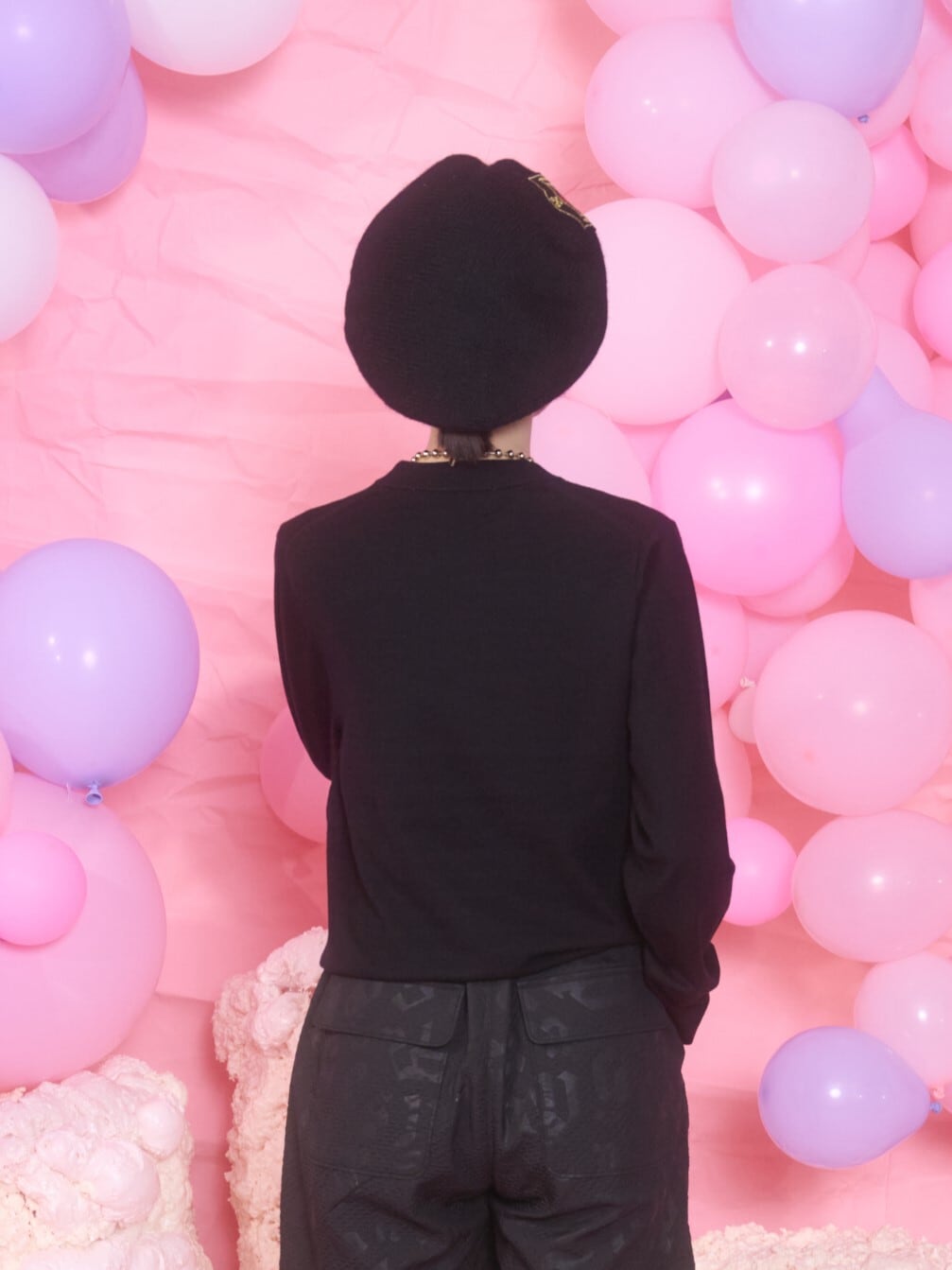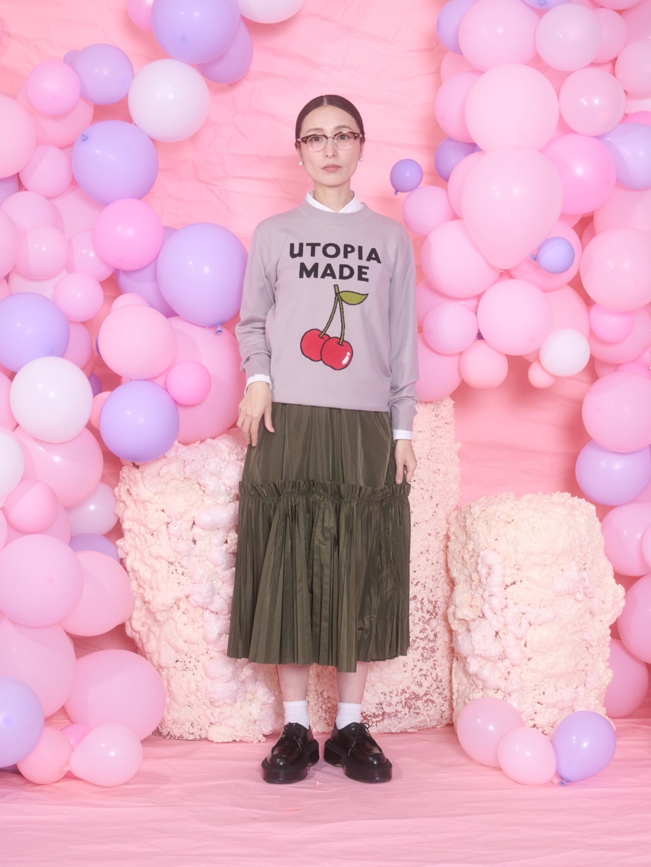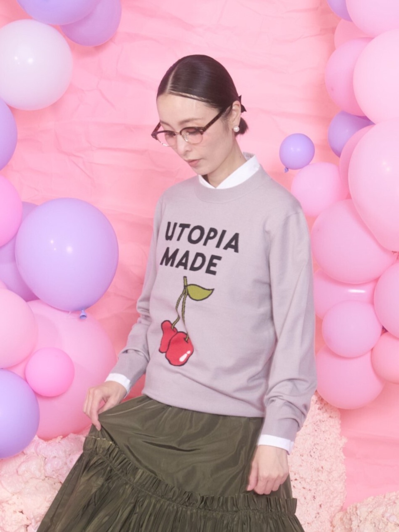 ユートピアで作られたチェリーの絵を描いて入れています。今回のユートピアのイメージは理想郷に入っていきたい、ストレスのない世界なんてないだろうけれどもそんな世界が未来にできたらいいな、という思いからこの言葉を選んでいます。トマスモアのユートピアが16世紀に一番最初に出版され、この言葉が初めて使われました。それはおそらく歴史の授業で知った言葉でした。私なりのユートピアのイメージは今回のコレクションのメインビジュアルになっています。ふわふわとした心地よい世界。イメージを伝えカメラマンとモデルに写真で表現してもらいました。ユートピアでできたチェリーはとても美味しい。このさくらんぼはユートピアでできたものです。さくらんぼの花言葉は”良心”です。心の声に耳を傾け、誠実に行動する精神、善良な教育、上品さ、幼いピュアな心、というものがあるそうです。みんなが良心という心で人々に接することができれば世界はきっと心地よいものになるのだろうな、なかなか出来はしないけど。という理想を表現しています。また現実的にはきっと出来ない、でも精神の世界で理想郷に入れたらいいな、という私自身の妄想でもあります。ベージュとブラックの2色展開。私はブラックがお勧めです。